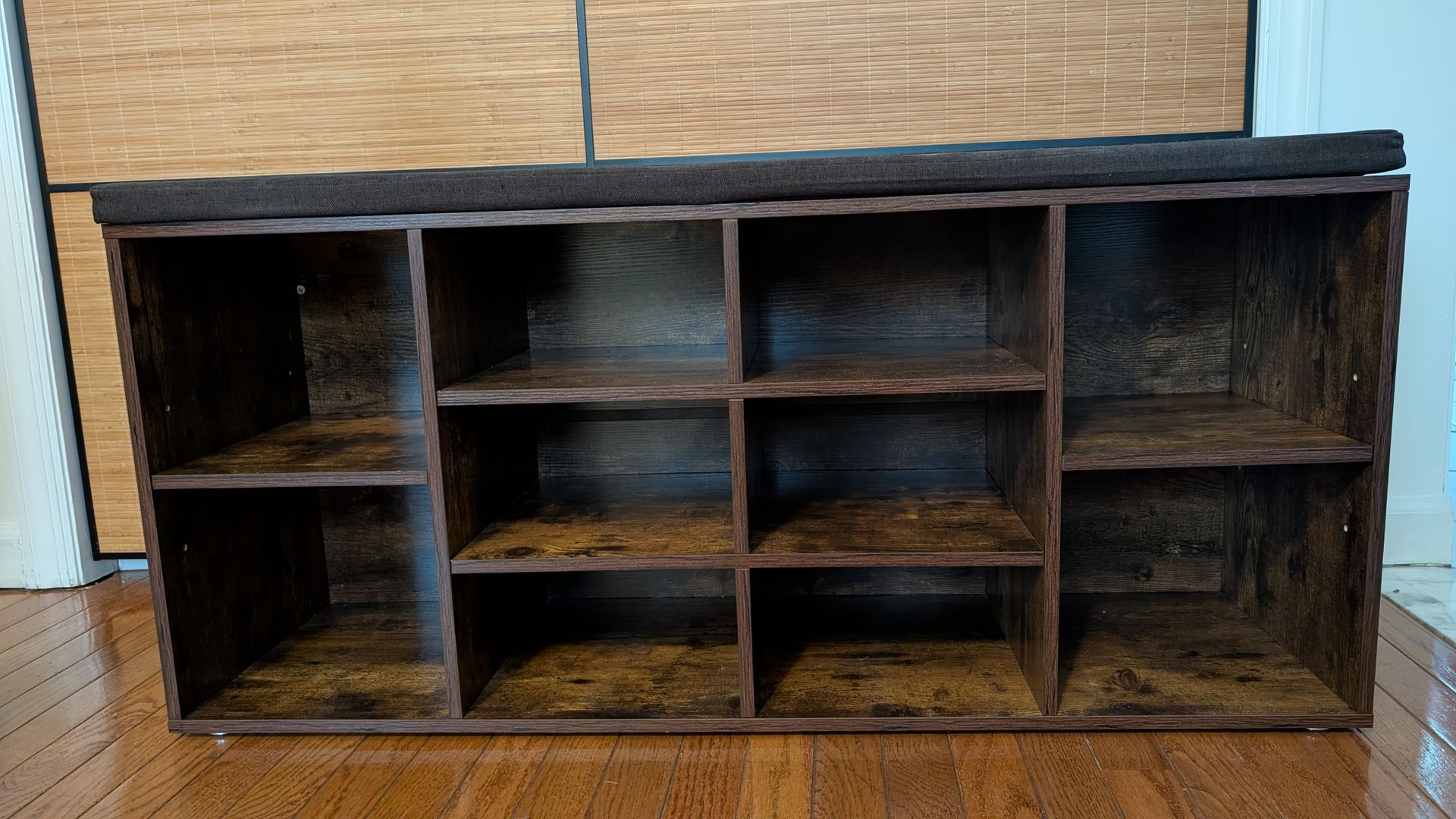 Sturdy shoe shelf with the option to use as a bench. Spacious and can fit multiple shoes. 41" long, 18" high (with cushion 19"), 12" deep . In great condition.