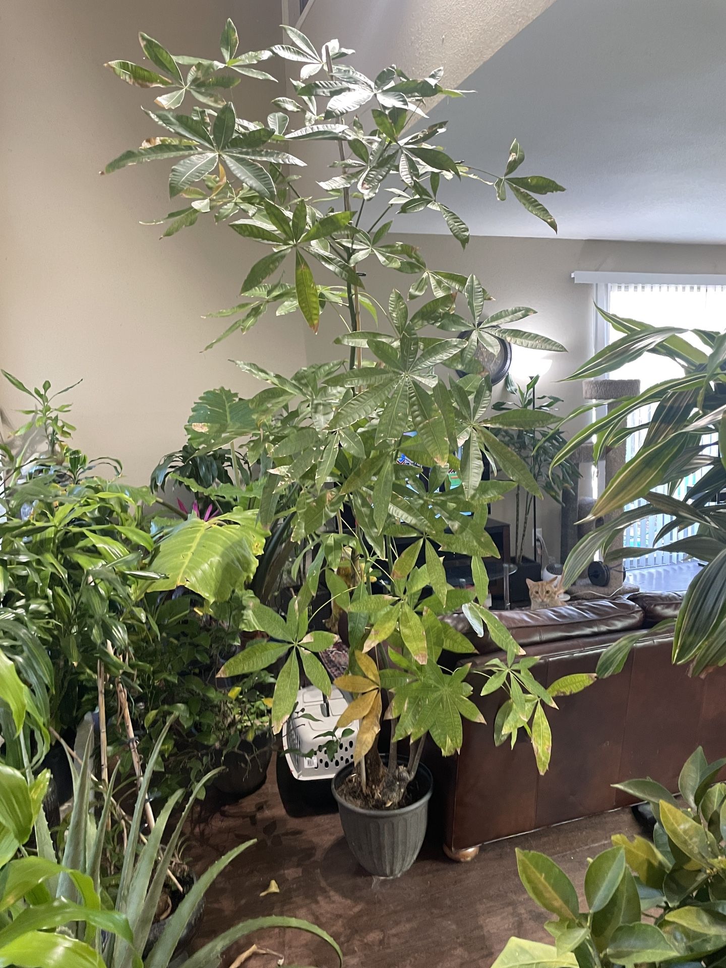 Money tree almost 9 feet tall Has been kept outside and tolerant of outside Houston heat , preferably not under constant direct sunlight I love this plant and plan to keep it but am willing to sell it for an amount that’s worth it for me It isn’t as bushy as it appears in the pics because there’s tons of other plants in the picture that makes it appear more full than it actually is. You can have it by itself or next to other plants for a striking and tall plant Selling to someone who can afford it without question You can get an even bigger bamboo stake and tie it up against it , it’ll grow even taller. I have a what looks like 15 feet bamboo stick I can give you to go with it I have wrapped around the middle copper wire. I wrapped this when I put the bamboo stake with it as well , I’m not sure which, if not both, made it explode in growth. I also had it outside when it got super tall. It grew like 4 feet in a single year when I did this. There’s two other stalks that are growing fast as well. These don’t have a stalk, but I imagine if you gave it one it’ll grow super tall too! If you’re interested let me know