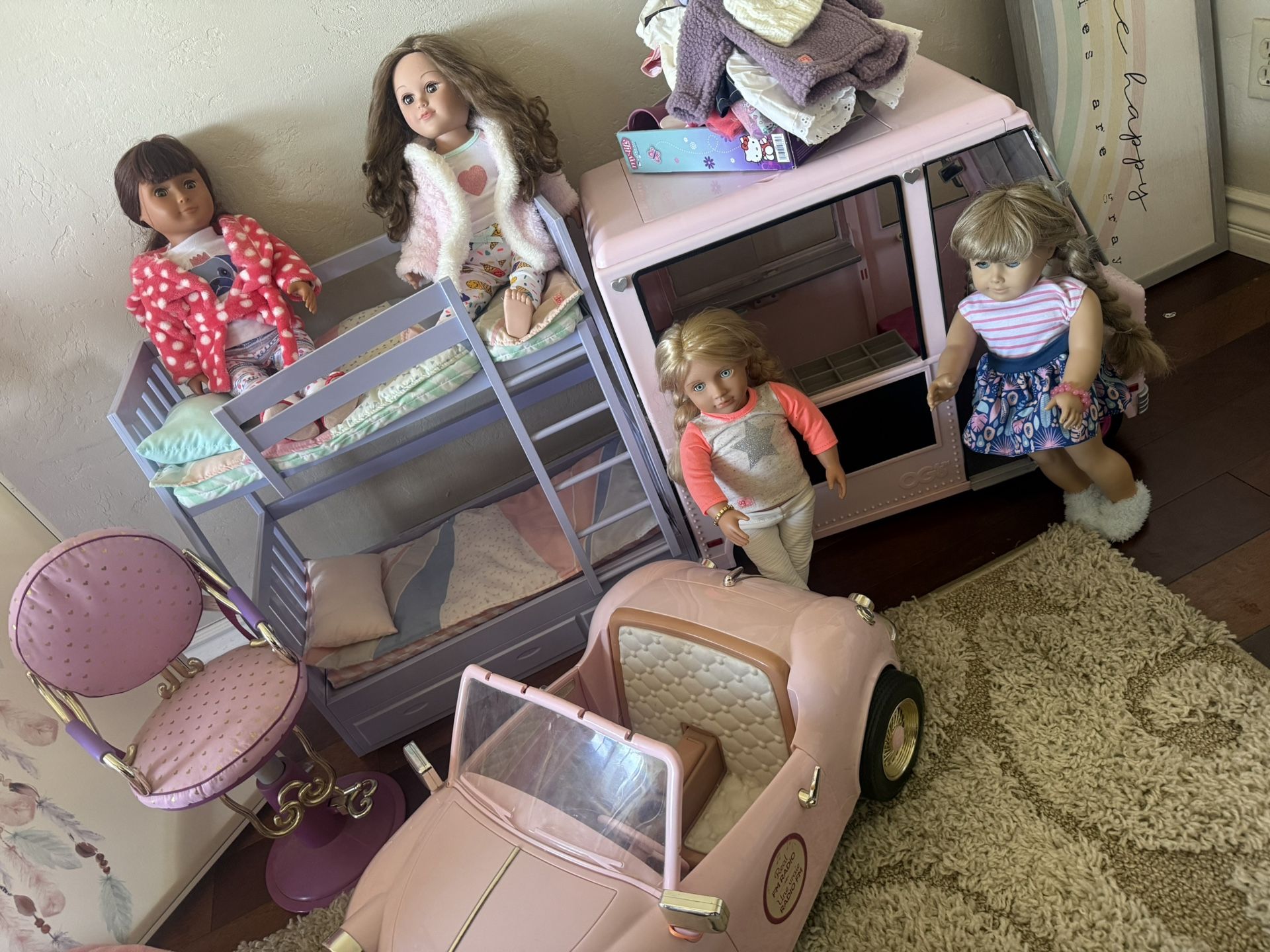 Our generation dolls, accessories, clothes, shoes, and furniture. Includes three dolls, lots of outfits, some brand, new hair, salon, chair, car, bunkbed, and ice cream truck with all accessories.