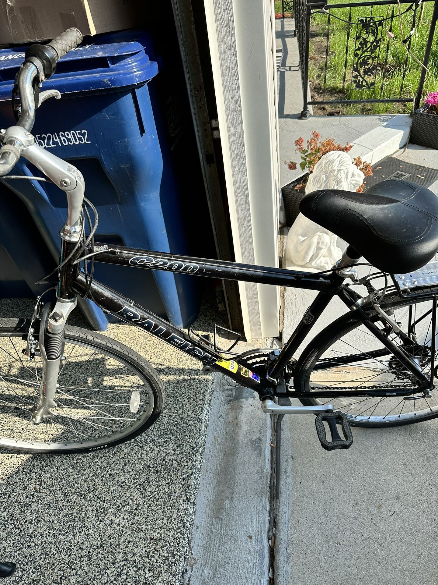 Used Raleigh C200 bicycle. Please see all pictures for details. Includes Water bottle holder, rear rack and bouncy seat. Pick up near Schaumburg High School.
