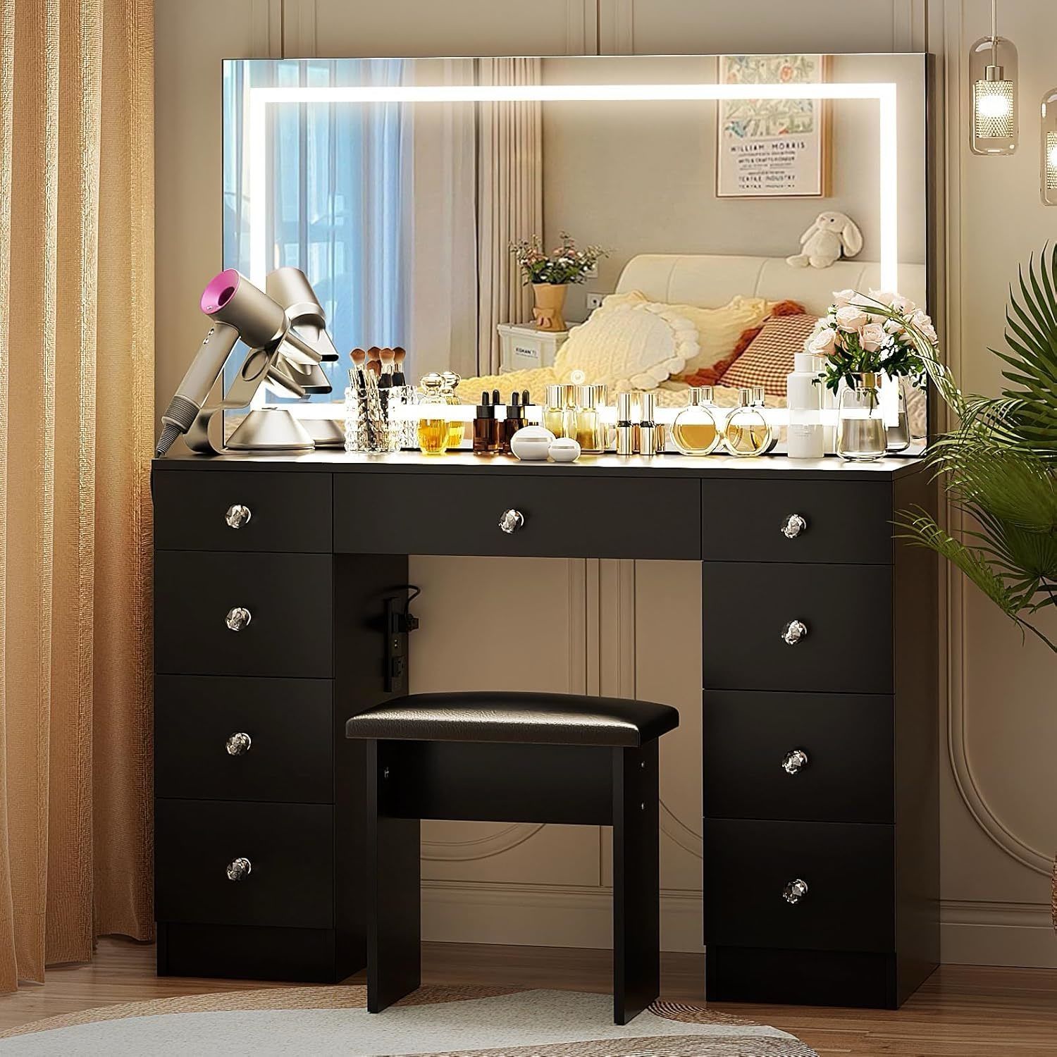 Vanity with Lighted Mirror - Makeup Vanity Desk with Power Outlet and 9 Drawers, 3 Color Lighting Modes Adjustable Brightness, 43" Vanity T