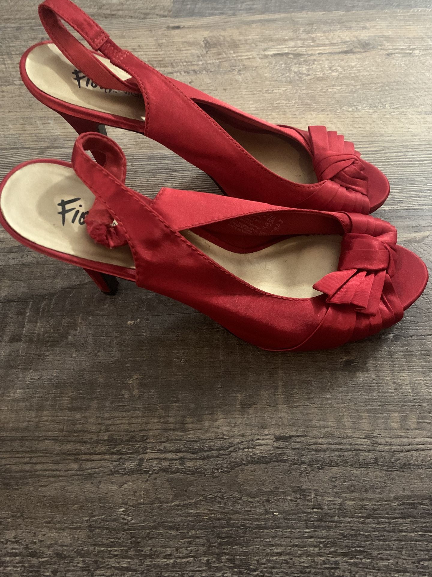 Beautiful red satin heels from Fioni Night, size 9.5. Peep toe and slingback style with a knotted front design. Gently used with minor wear on soles, otherwise in great condition. Perfect for formal events, parties, or a pop of color for any outfit.