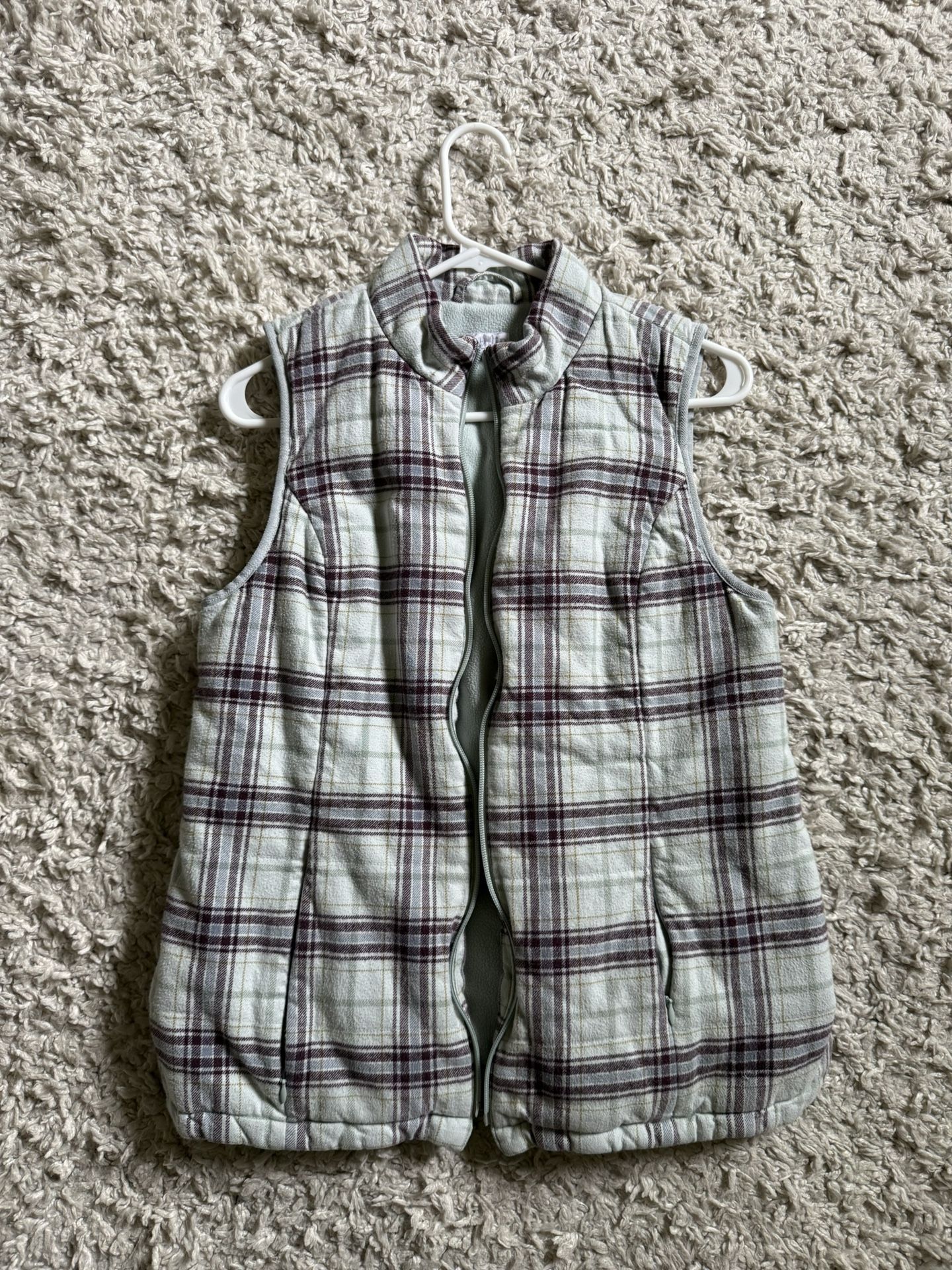 Brand-J.Jill Color-Jade Plaid Women’s Curved Hem Full Zip Flanel Vest Fleece Lined Zip Pockets Size-Small Missing the Zipper, needs replacement or can be worn opened as well #JJill #JadePlaid #Plaid #Women #Vest #WomensVest #FlanelVest #CurverHem #Fleece #GoodDeal