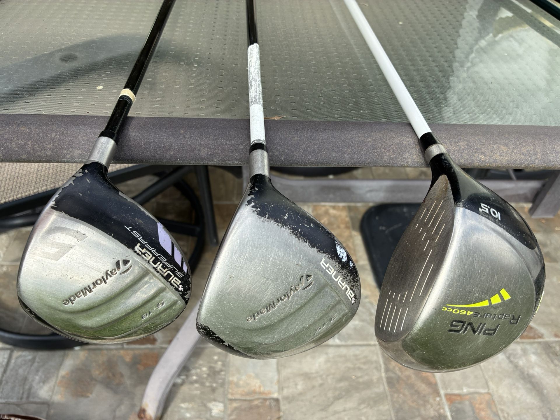 Women’s Ping driver and Taylormade 3 and 5 woods. Excellent used clubs. Price is very low if you compare. ALL 3 NEED NEW GRIPS at about $13 each at any golf shop. Price for clubs is firm at $40 total. I meet at the parking lot of OsoCreek Golf Course in Mission Viejo.