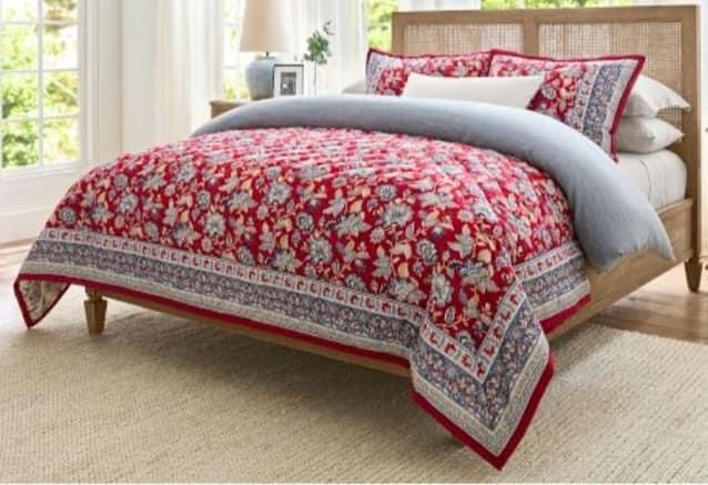 King Pottery Barn reversible quilt and two king shams. This is not my bedroom, but a good picture of the quilt. The other picture shows the reversed side of the bedspread and sham. Both really pretty. Bought in August, but doesn't go with our room. Asking $130 for all.