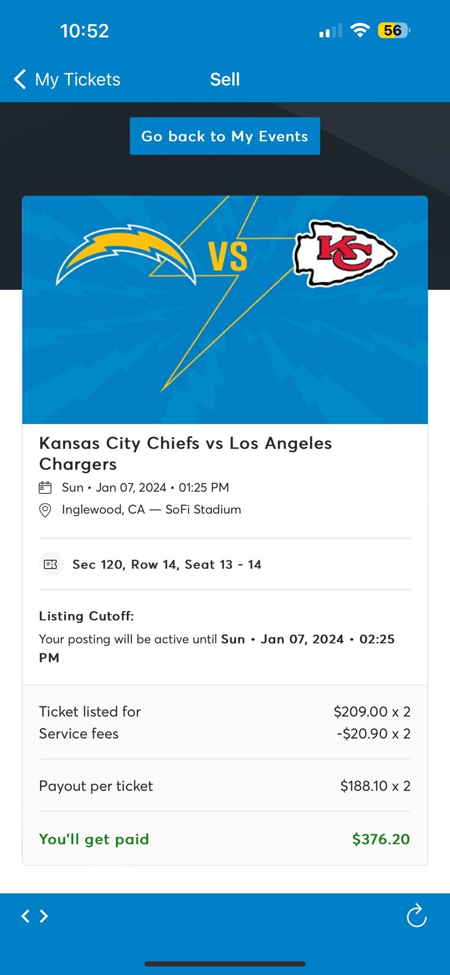 Kansas City Chiefs VS LA Chargers Last game of the season. Section 120 Row 14 Seats 13 & 14 $300 total