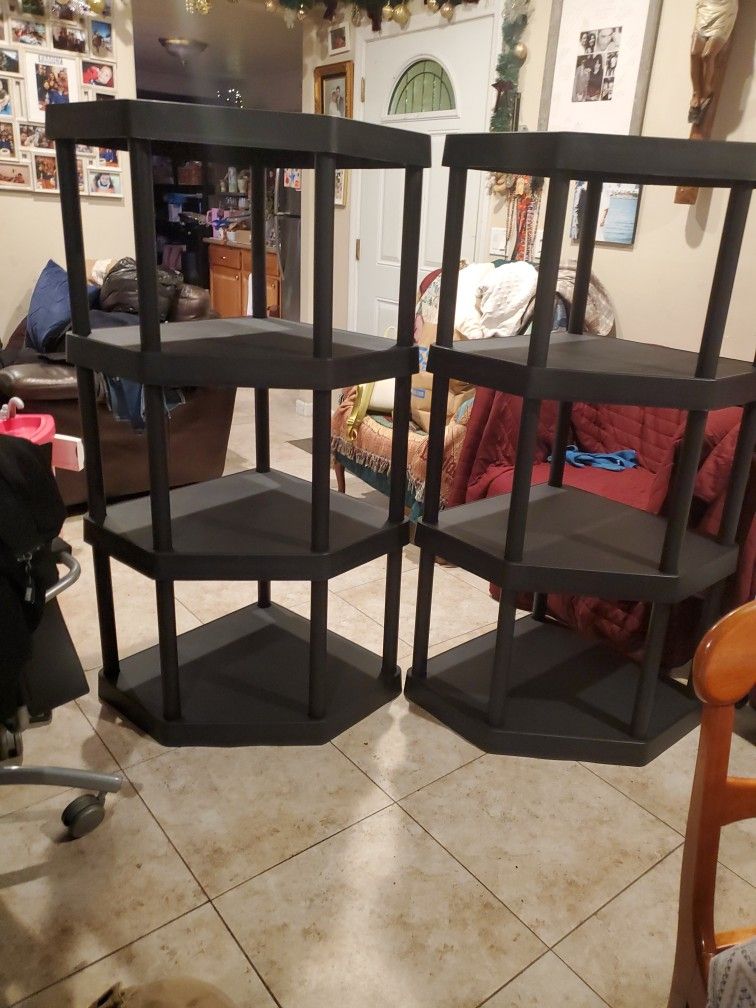 Brightroom 4 Tier Plastic Corner Shelf Unit used in excellent condition. 5 minute assemble and disassemble time. There are 2 total. Sturdy strong solid shelves. Overall Dimensions: 55.75 inches (H) x 23.73 inches (W) x 23.73 inches (D) Weight: 13.99 pounds Maximum Shelf Weight Capacity: 70 pounds per shelf 50 for both Check out my other listings thanks for looking Cash or zelle only please Pickup only.National city area