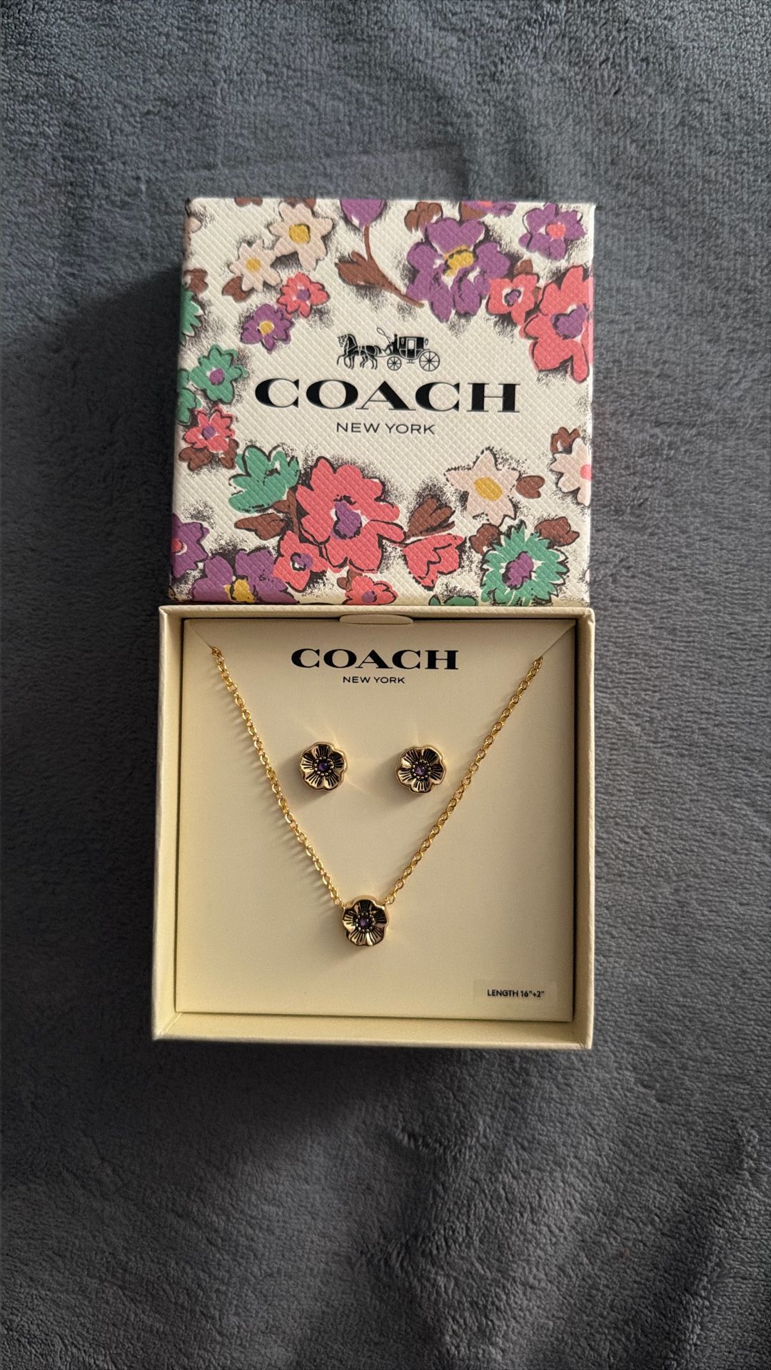 Super cute gold-tone flower set from Coach. Comes with matching necklace and stud earrings. Perfect for gifting or everyday wear. Authentic Coach — comes in original box.