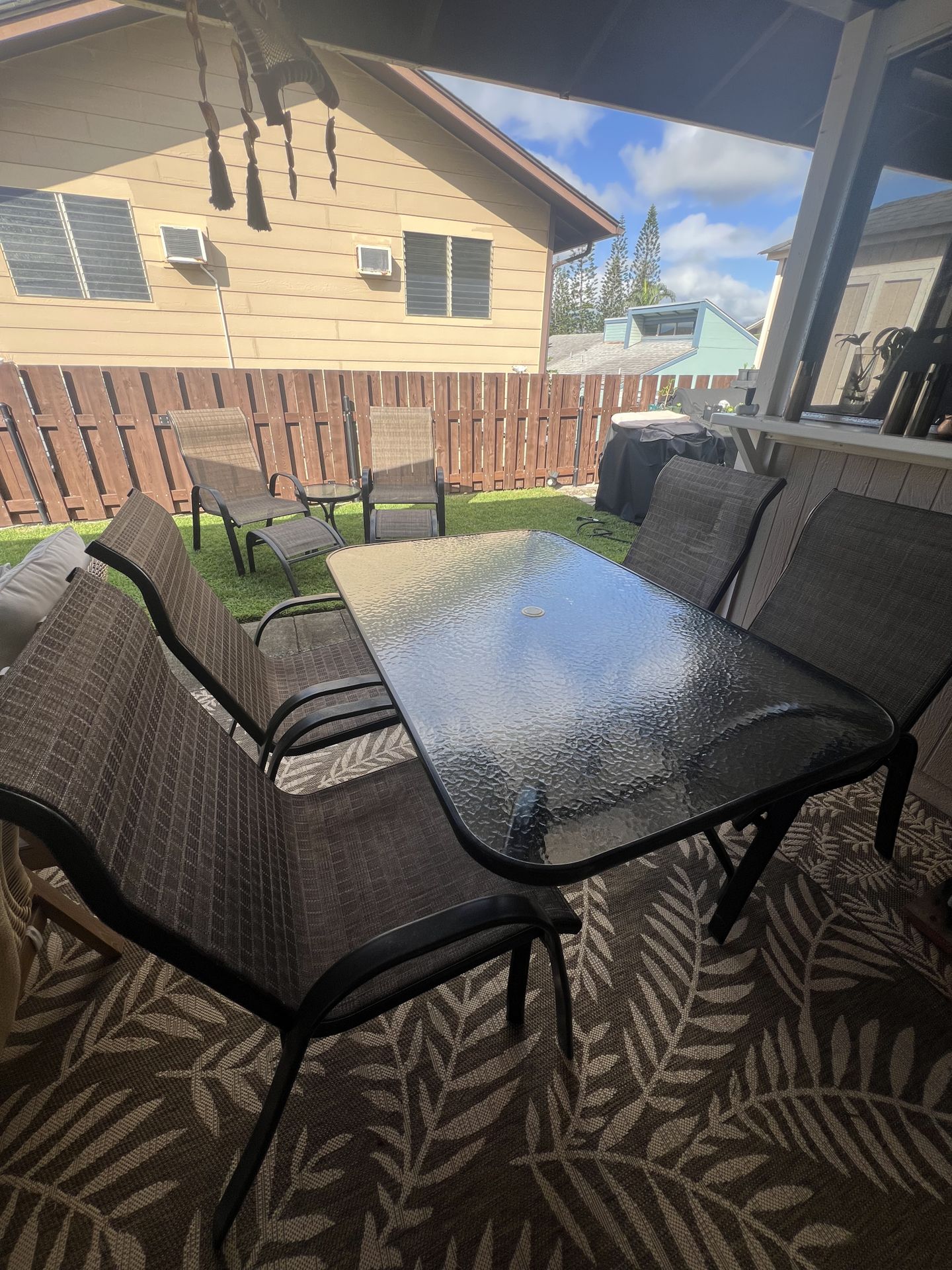 Tempered glass top and metal frame dining table 60” L x 38”W x 28” H. 4 dining chairs plus 2 additional chairs with foot stools and round side table. Foot stools can be stored under the chairs and the table can seat all 6 chairs. Good condition, normal outdoor wear. Pick up in Mililani Town.
