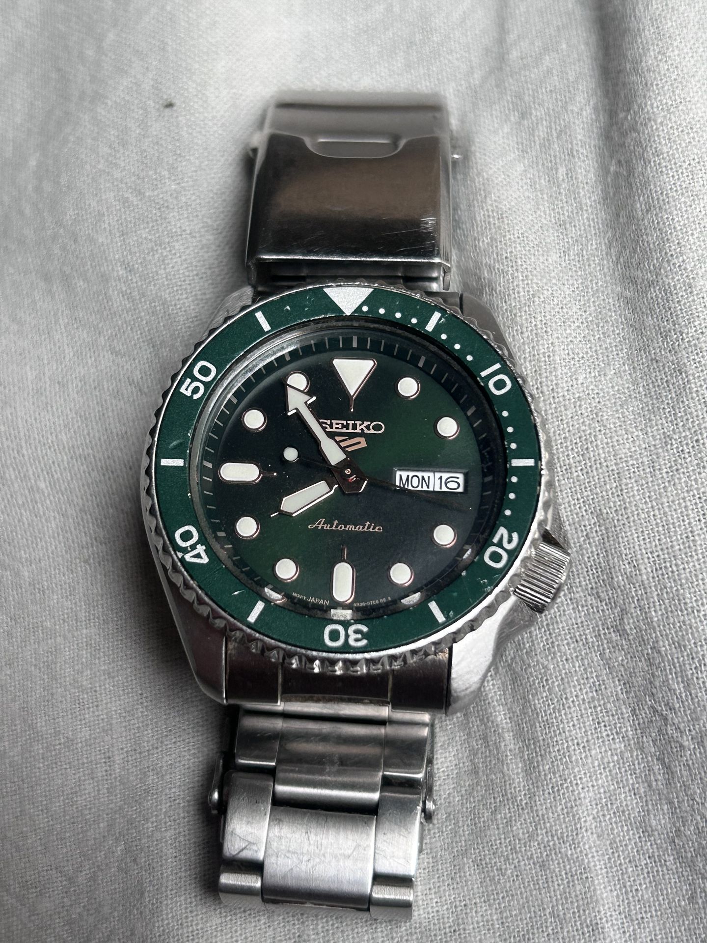 Used Automatic movement Seiko. Green face with stainless bracelet. Solid watch. Can use a good polishing to look brand new.
