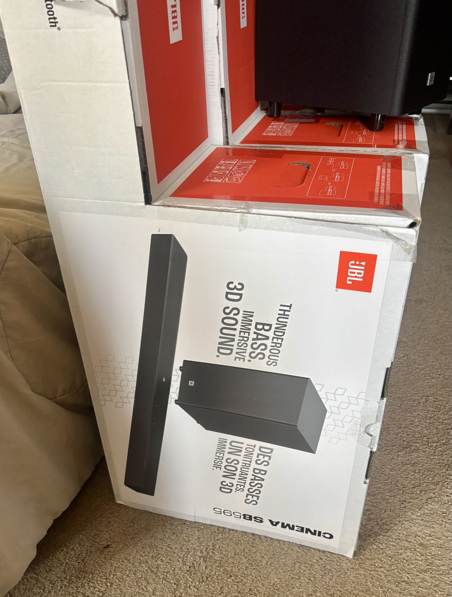 New, Open, Fresh in Box. Available For PickUp. Contact Me For Any Questions. We Speak Spanish as well. 🚀 VISIT MY PAGE FOR MORE PREMIUM ELECTRONICS 🚀 ≠≠≠≠≠≠≠≠≠≠≠≠≠≠≠🚀 FEATURES & SPECS 🚀 • 3.1.2 Channel Surround Sound – dedicated center channel with dual upward-firing Atmos drivers • Dolby Atmos® 3D Audio – immersive cinematic sound with realistic height effects • Wireless Powered Subwoofer – deep, punchy bass without extra cable clutter • 440W Peak System Output – powerful JBL sound that fills the room • Up-Firing Height Speakers – creates true overhead surround effects • 4K HDMI eARC Support – high-quality audio passthrough for modern TVs • Bluetooth Wireless Streaming – play music directly from your phone or tablet • JBL Signature Sound – crisp dialogue, detailed highs, and powerful low end • Simple Plug-and-Play Setup – no AV receiver required ≠≠≠≠≠≠≠≠≠≠≠≠≠≠≠DIMENSIONS & WEIGHT—— Soundbar: • 45.7” W x 2.6” H x 4.2” D Subwoofer: • 12.0” W x 17.3” H x 12.0” D ≠≠≠≠≠≠≠≠≠≠≠≠≠≠≠WHAT’S INCLUDED—— • JBL Cinema SB595 Soundbar • Wireless Subwoofer • Remote Control • Power Cables