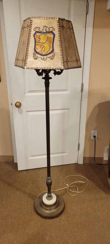 Antique Floor lamp with vintage leather painted heraldic crest. 62" from base to top of shade. Three way switches