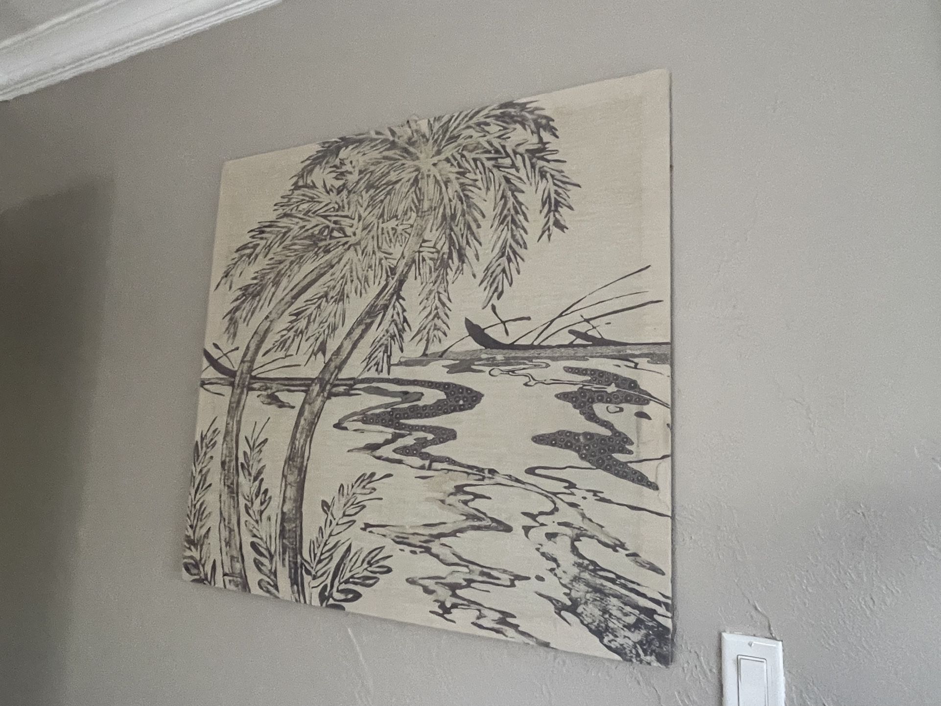 Beautiful original artwork on cloth canvas. 35” wide by 33” tall. Hangs by wire string (shown in last photo).