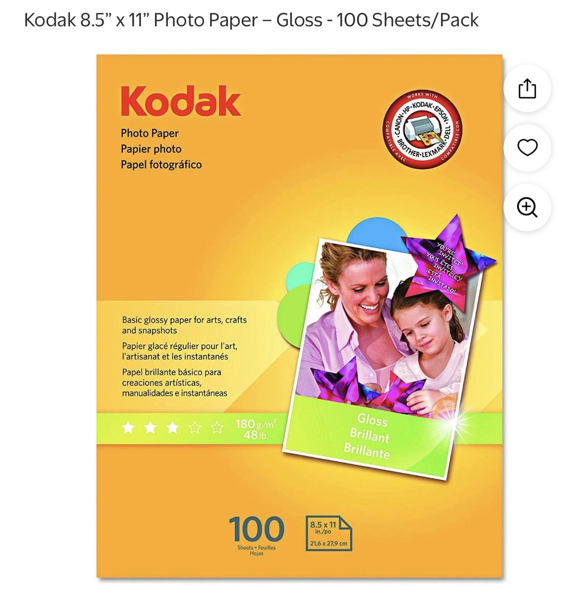 8.5” x 11” Kodak Photo Paper – 48 lb. Basis Weight – Glossy, 100 Sheets/Pack. Basic glossy paper for arts crafts and snapshots.