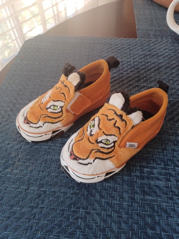 Toddler Size 6, in awesome condition, slip on vans with side velcro securing featuring a vibrant orange tiger. Perfect for the current season, travel and everyday use.