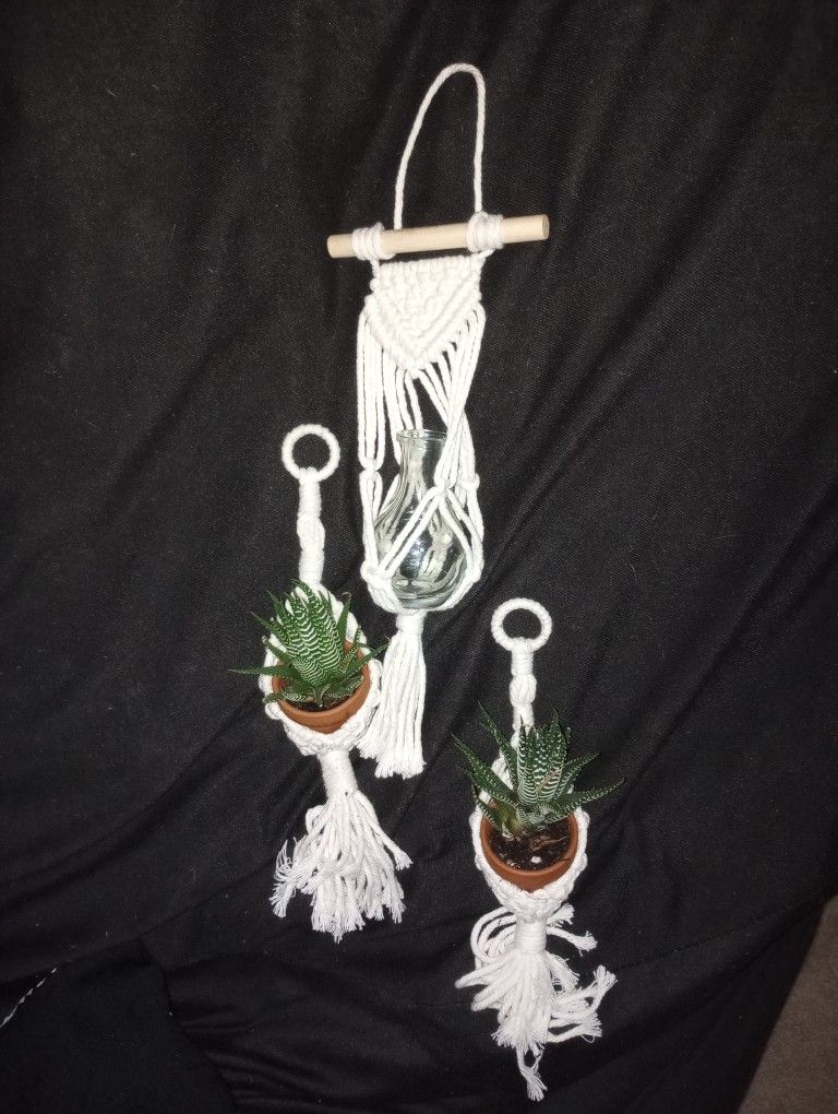 2 macrame hangers that hold little inch clay pots. There is one stick hanging macrame holder that holds a glass jar in it. Selling only the macrame pieces the clay pots and succulents aren't included.