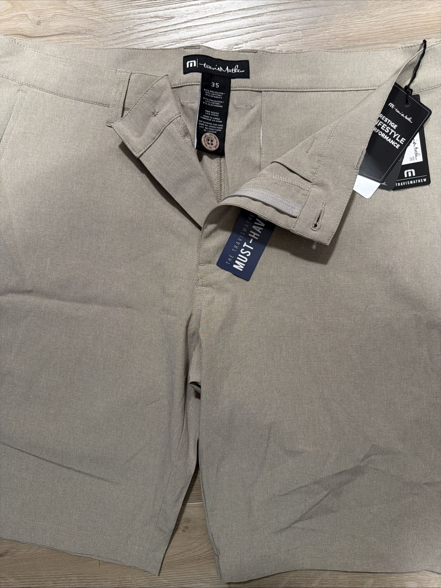 NWT Travis Mathew Prestige Performance Shorts Men Size 35 Beige Stretch Khaki