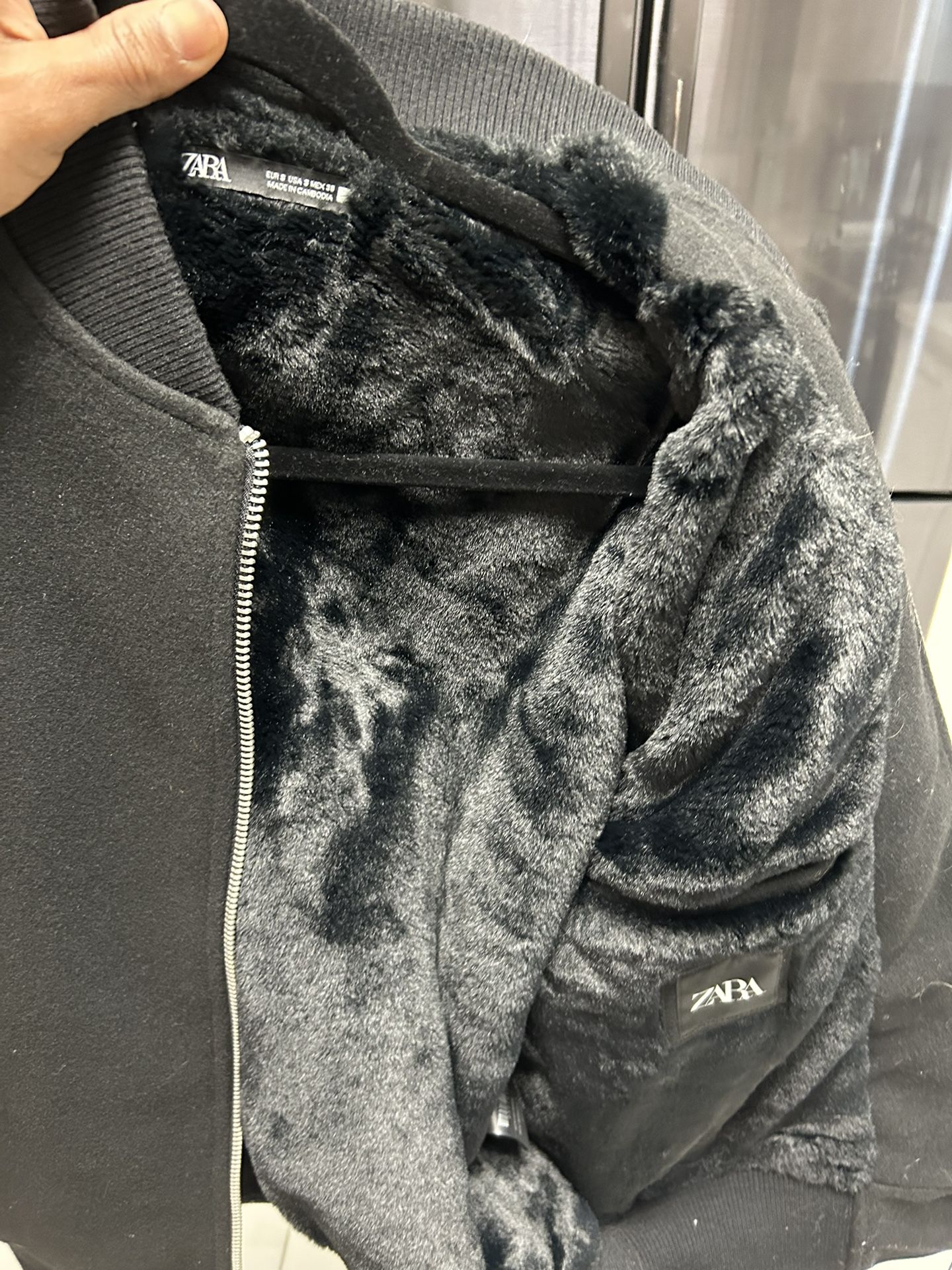 Relaxed fit bomber jacket with tonal faux fur interior.