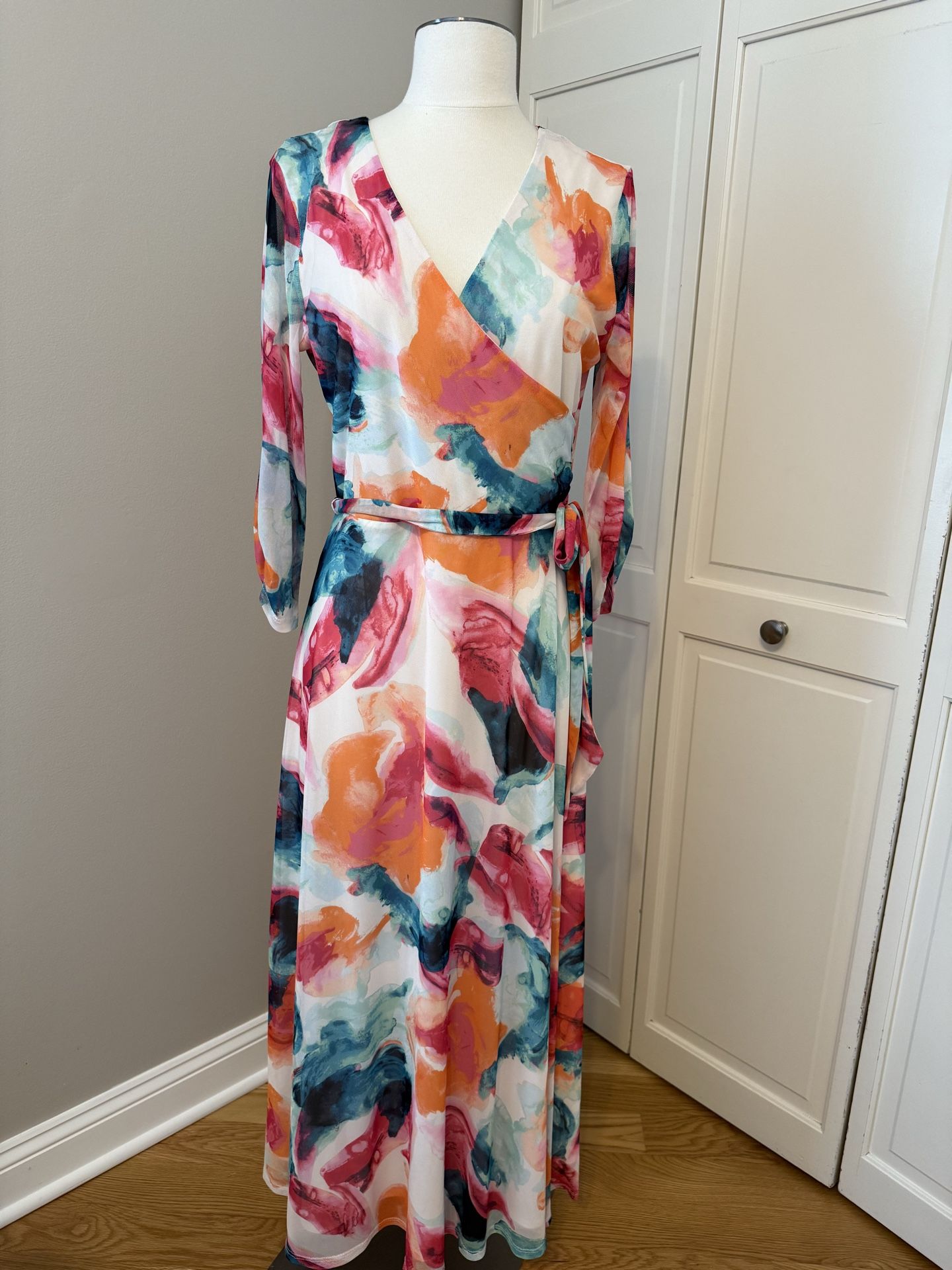 Watercolor mesh dress, 3/4 ruched sleeves . Excellent condition. See pictures for details.