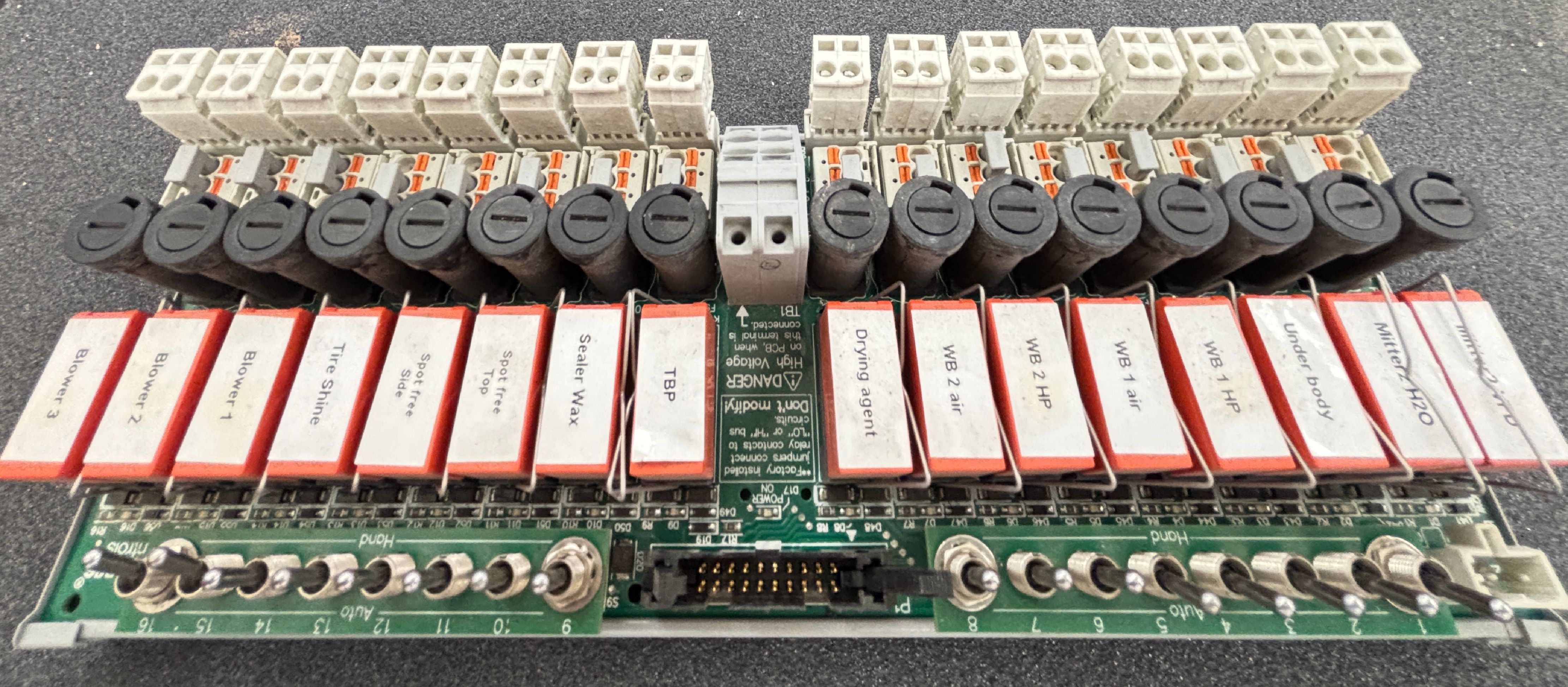 10 in Stock WAGO relay interface/output board, part #8002-0100/1000-0051. Label shows input 24VDC (9W max) and output 24–250V AC/DC, 0–60Hz, 2.5A max per relay (40A total). Board is labeled for car wash functions and includes terminal blocks and manual switches. Sold as pictured.