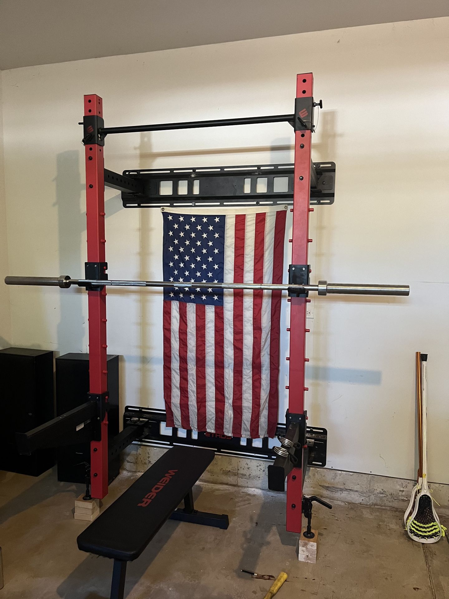 Up for sale is an Ethos Rack that folds against the wall. There is a rack, safety bar catches, and olympic bar, 210lbs in bumper plates, and a small bench. The entire set if in fantastic condition. There is also a variety of kettle bells and single dumbbells. Feel free to make and offer or part it out however you would like.