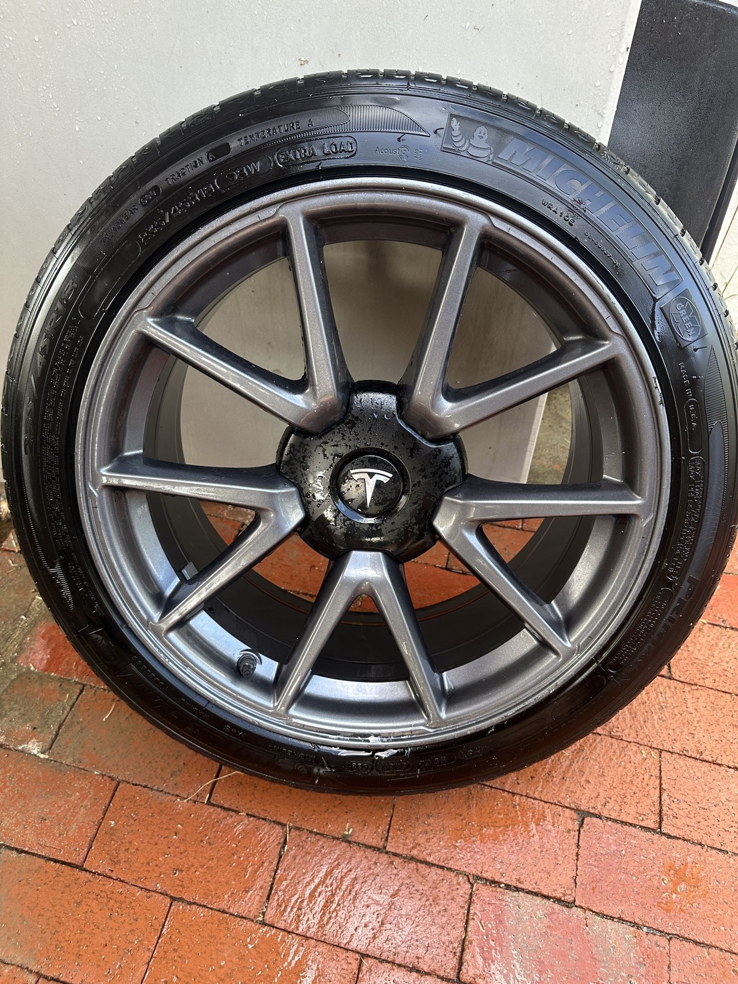 - Lightly Used, less than 1k miles on them. - Pulled from 2022 Model 3 LR. - Will clean before pickup. - Tesla center caps included. - Tesla TPMS included. - 235/45 R 18 tires Pickup in Riverside only. Cash/ Zelle/ Apple Pay.