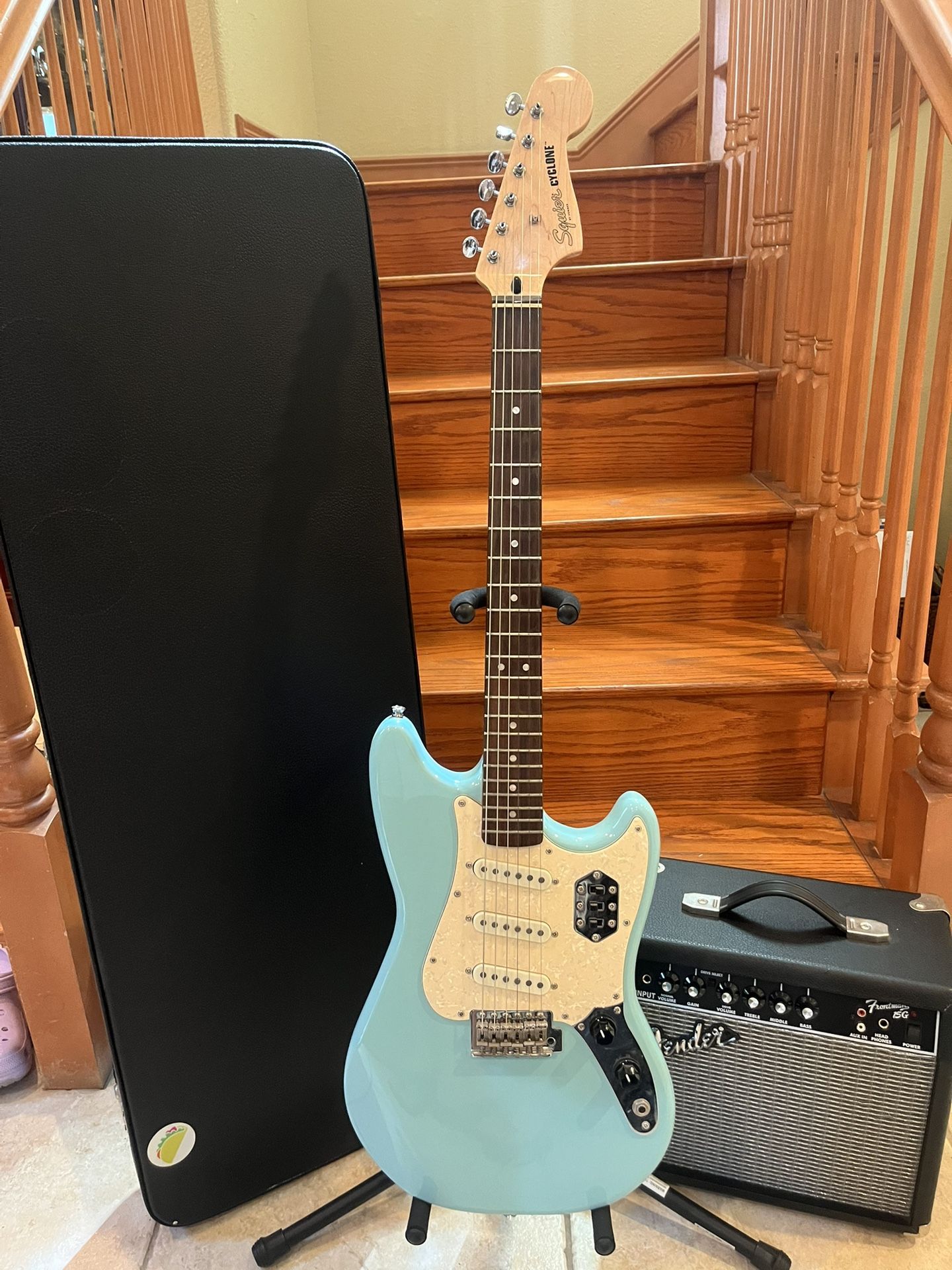 Beautiful basically brand new paranormal cyclone. These were a limited run that they don’t make anymore gorgeous blue finish. It’s like a mustang with some features you’d see on an offset fender. Tested and working well and setup by a pro and feels great Pristine condition Hardshell case Comes with guitar cable, strap