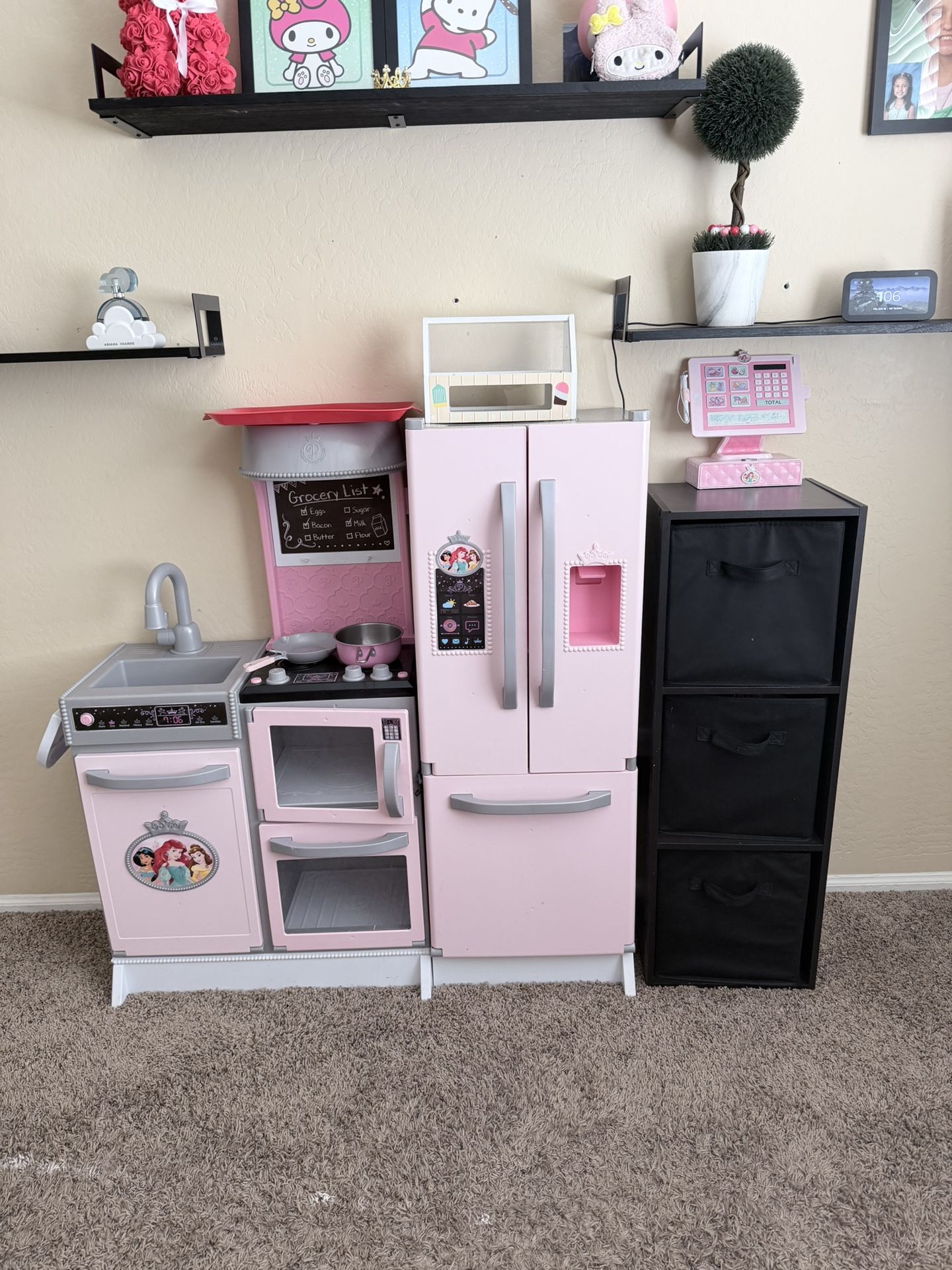 SOLD TOGETHER. Kitchen Black cubby w/3 bins Cash register Princess frame Pink phone/laptop Puppie with carrier Pink cart Princess suit case /headphones