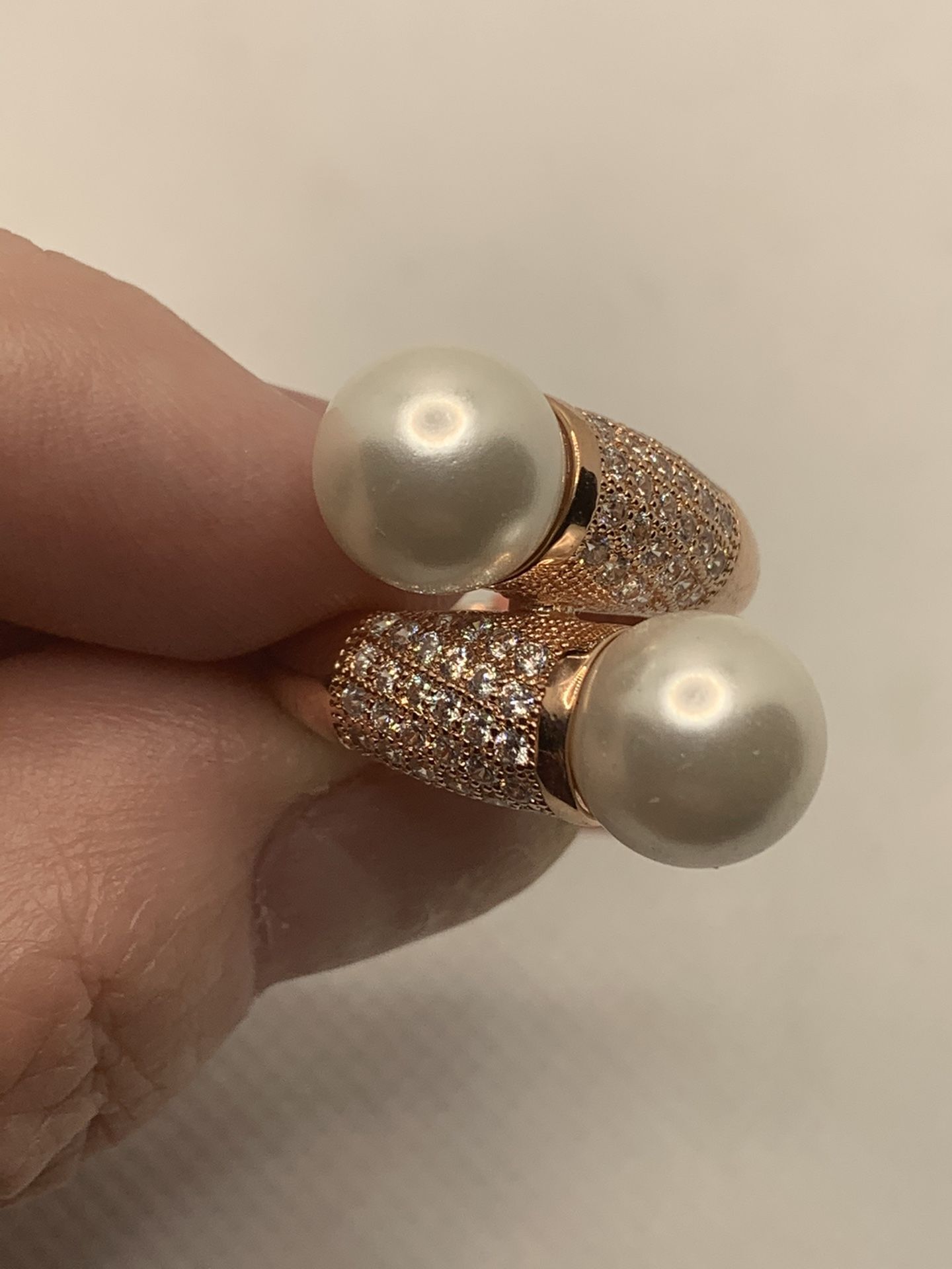 WHITE SHELL PEARL SIMULATED DIAMOND RING SIZE 6, IN ROSETONE