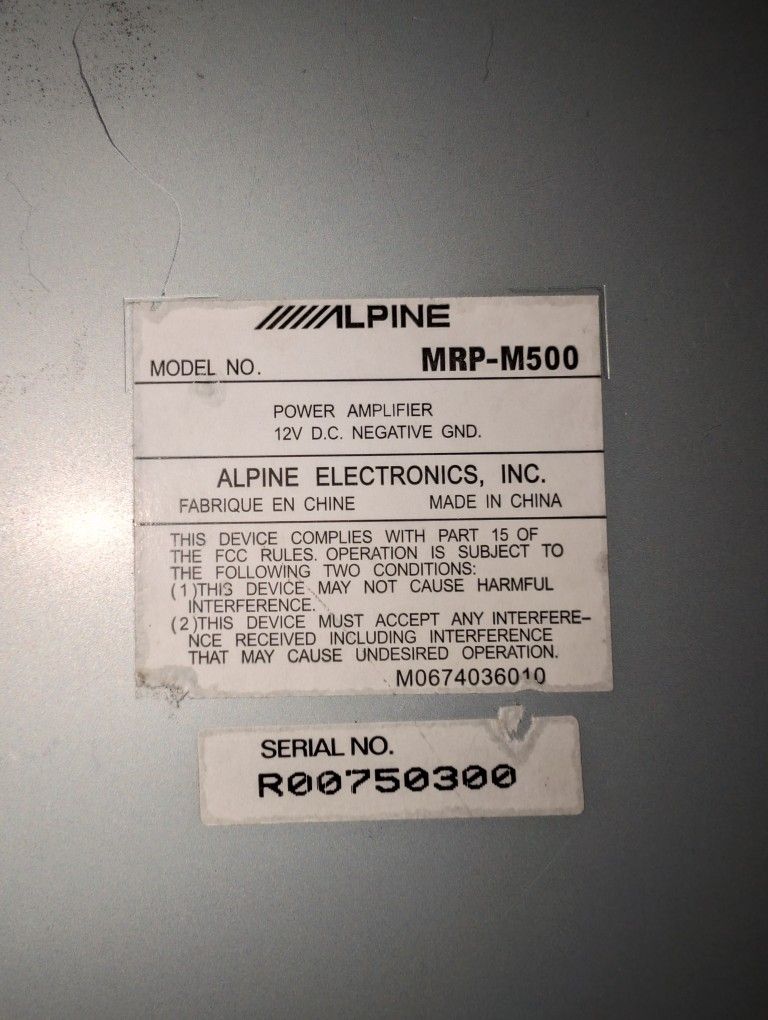 I have for sale an Alpine car amplifier model MRP-M500. This is a class D monoblock (1 channel) amplifier that is made for subwoofers only and rated at - clean 500 watts RMS at 2 ohms. It is in good physical condition showing light signs of previous use and it is in perfect working order.