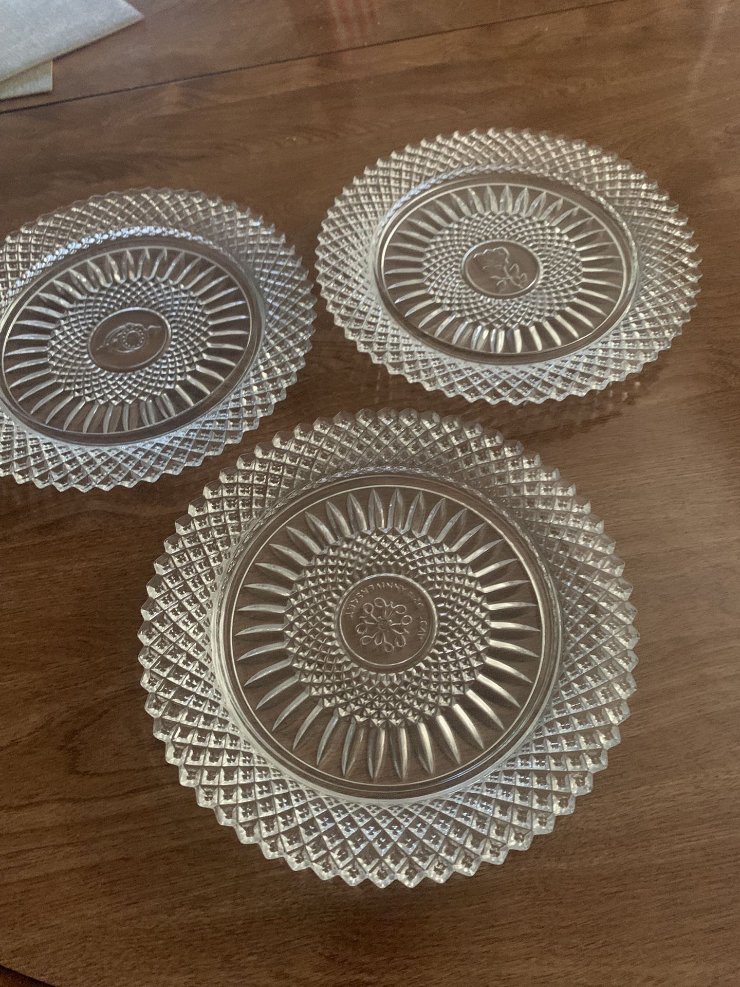 Beautiful heavy crystal 8 inch plates. Has about a 1 inch edge with about a quarter inch insert so salads or dessert sit in and won’t slip off the plate perfect condition. All of them comes with their own box.