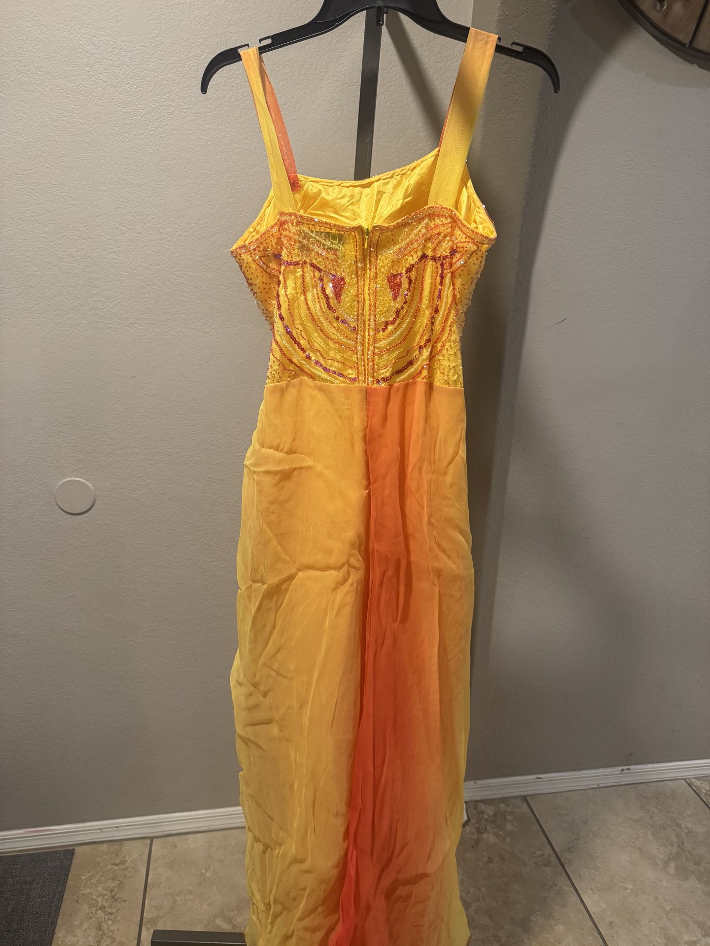 Yellow/orange beaded maxi dress with ruffle detail and tie back. Size: 10 #fairycore #prom #eveningwear