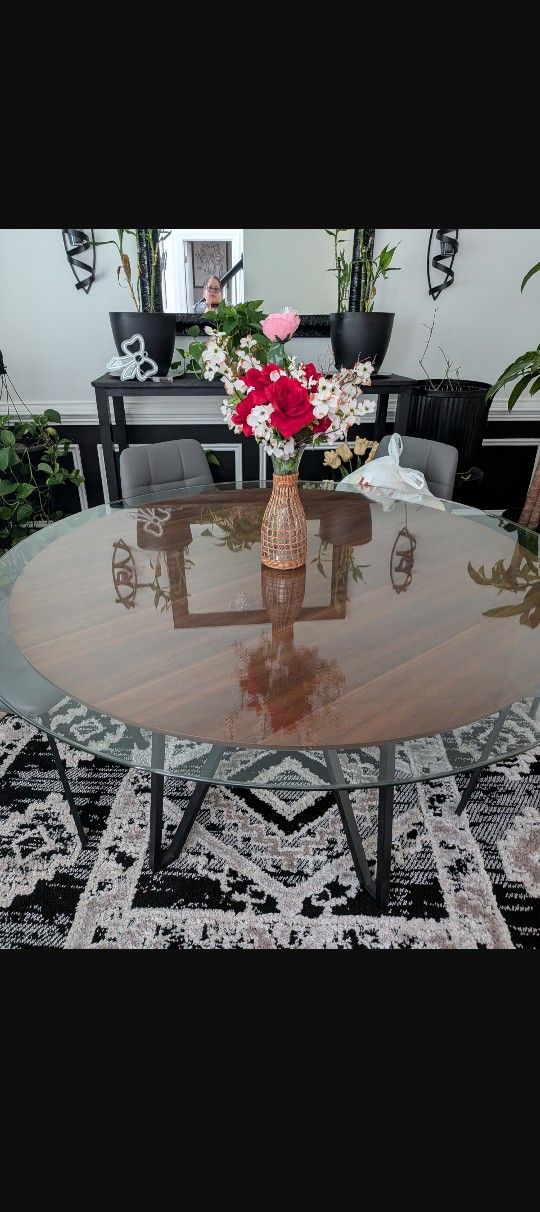 6 Chairs And Wood Table With Glass On Top.