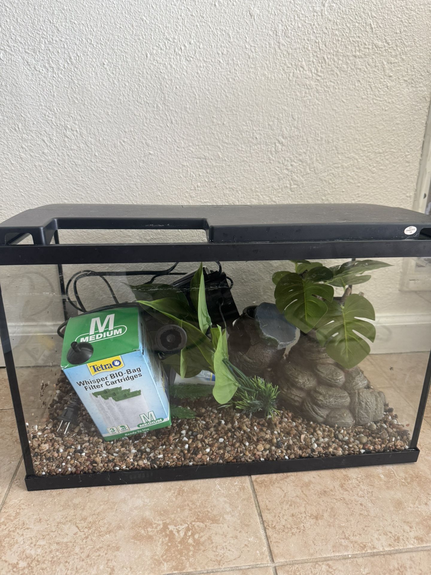 Bought this tank recently, but my fish died.. More work than I thought.. everything’s new. Comes with a little LED light and water conditioning + everything in the photos