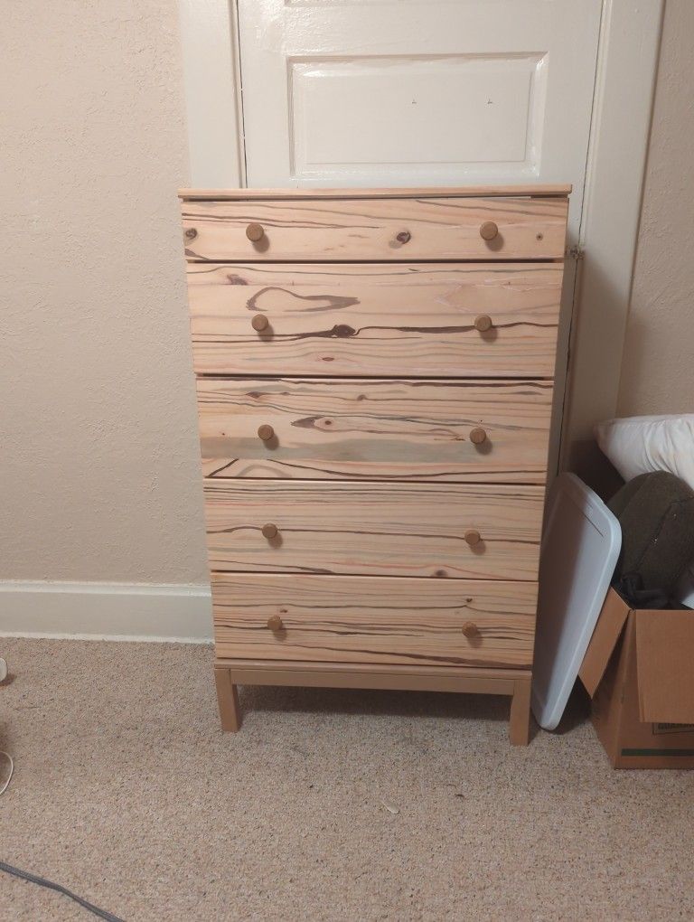 Solid wood IKEA dresser. Hand painted. Some drawers bowing on the inside and legs are a bit loose, but can probably be easily fixed.
