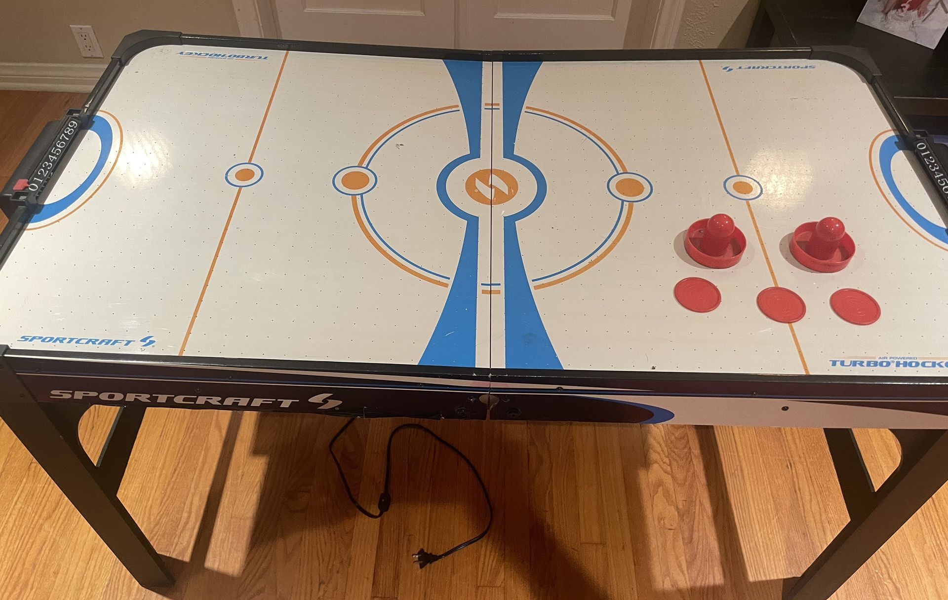 Air Hock table comes with 2 mallets 3 pucks and is in good condition