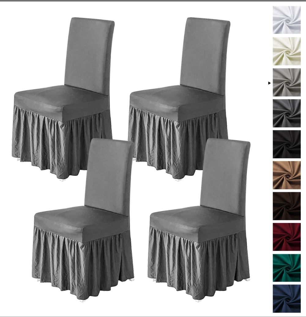 molasofa Chair Covers for Dining Room Set of 4 Stretch Chair Slipcovers with Skirt for Kitchen Seat Protectors Wedding Banquet Decor Kids Pets Spandex Fabric Washable (4pcs, Light Grey) In the picture it looks shiny but it’s not Retail price: $40 + tax INV: 939114