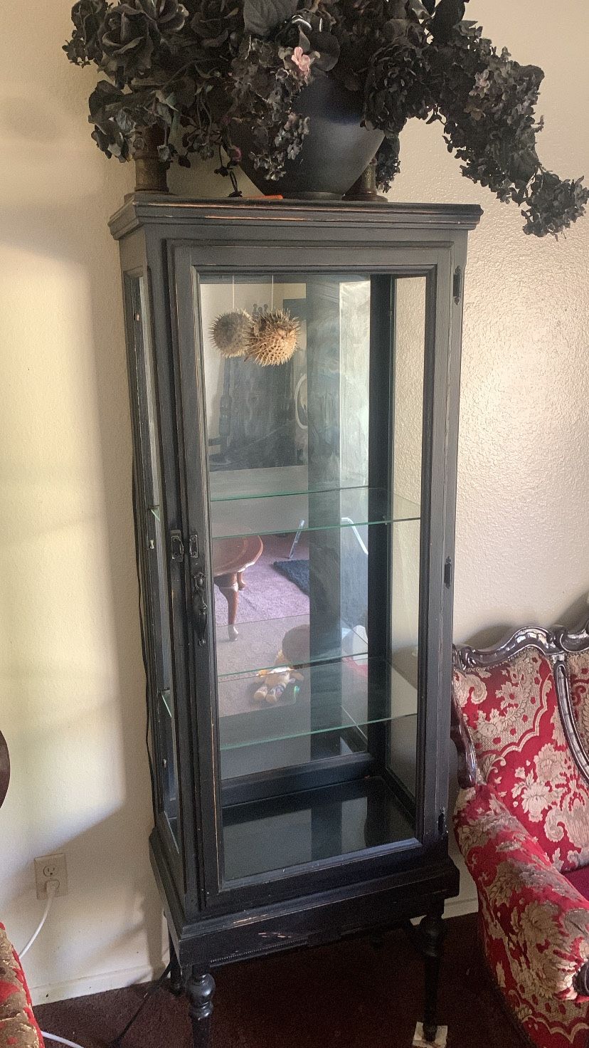 Curio Real wood Missing glass on door And one side Blow fish chandelier And black floral arrangement included