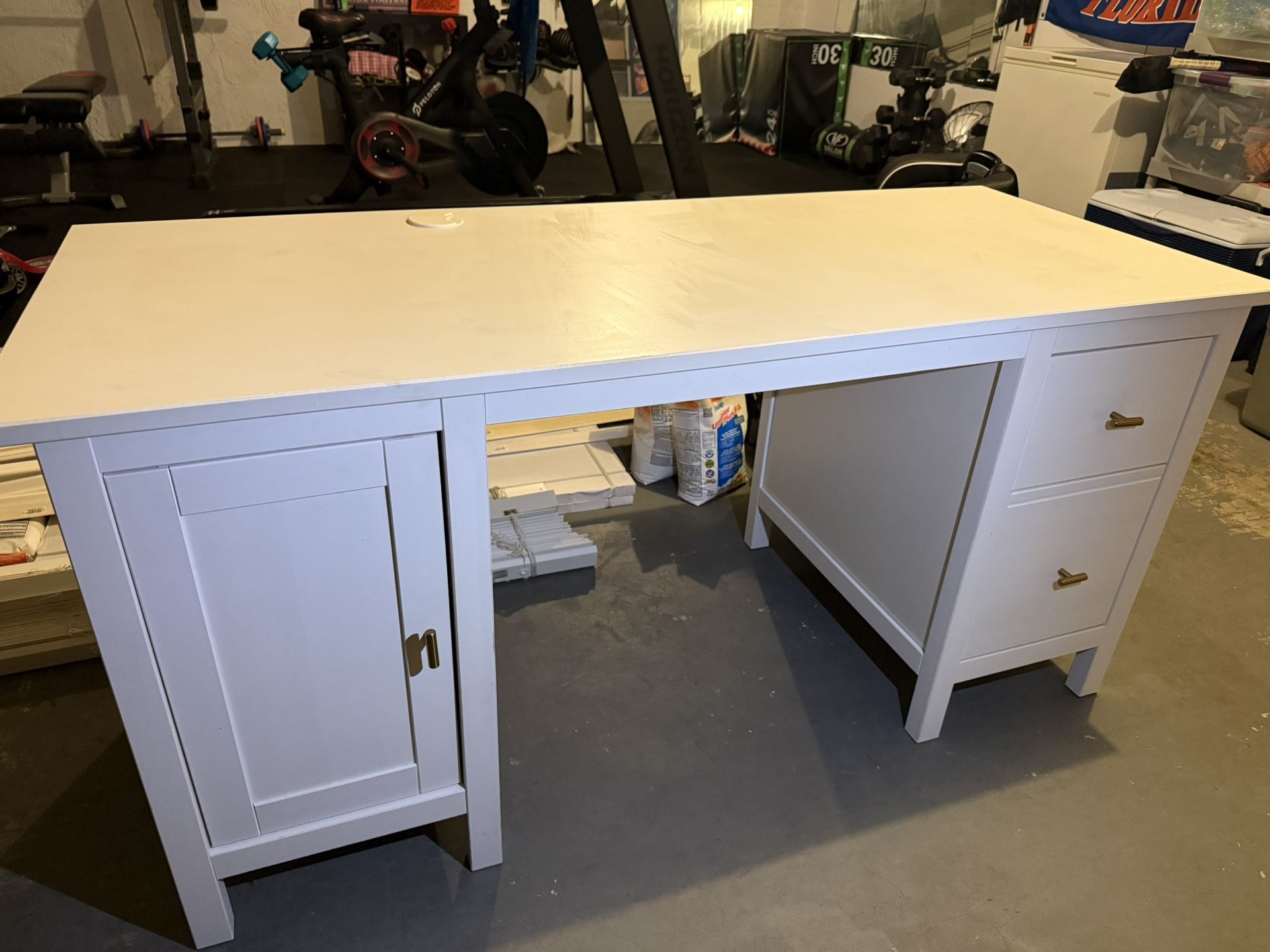 White IKEA desk in great condition with built-in storage. Features a large work surface, two drawers including a file hangar, and a cabinet with adjustable shelf, plus a cord grommet for easy cable management. Clean, sturdy, and gently used with minimal wear. Dimensions are approximately 61” W x 25.5” D x 29” H. Perfect for a home office. From a smoke-free home. We have two available but can be purchased separately.