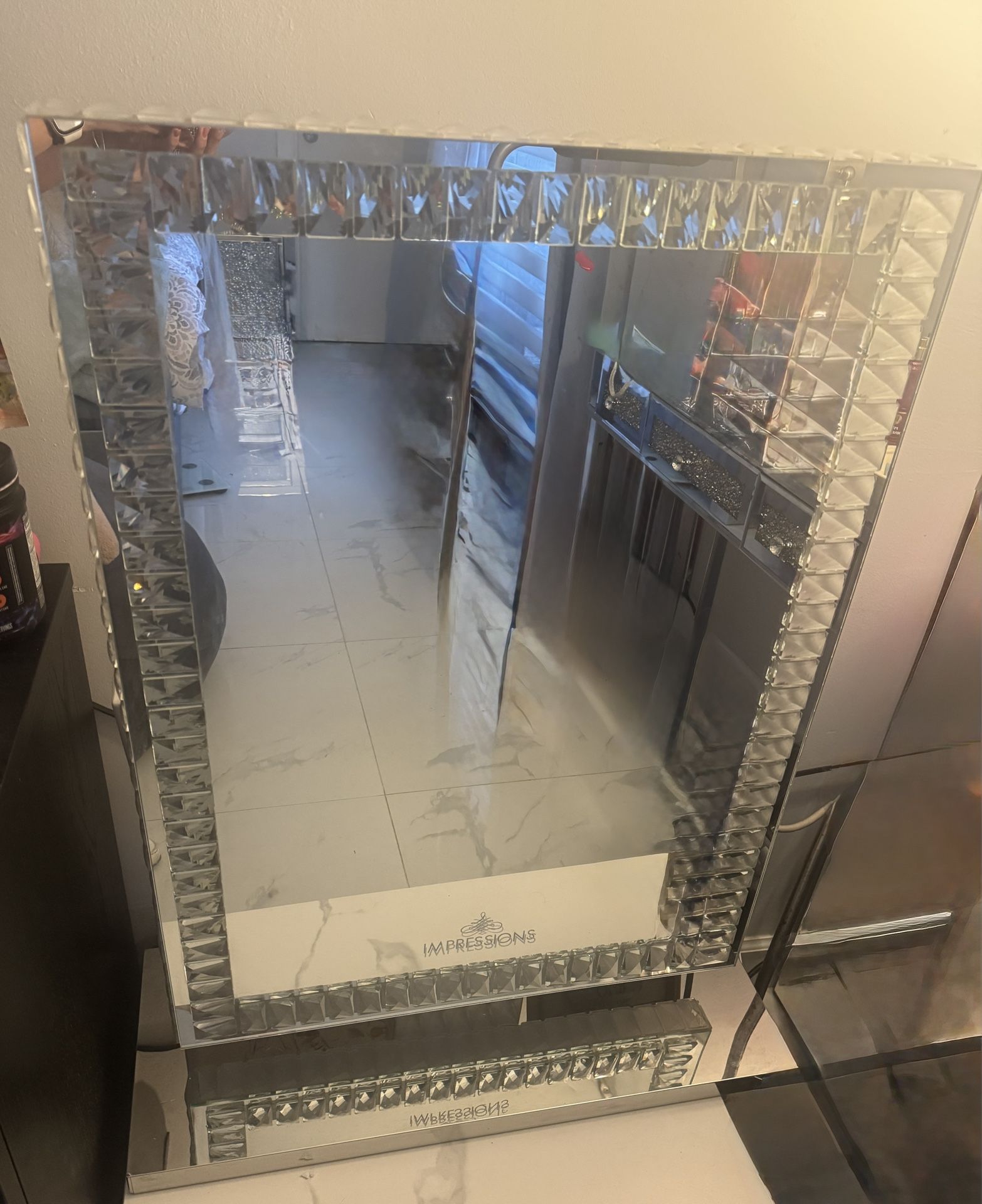 Impressions vanity diamond princess collection mirror. In great conditions, heavy duty , description and dimensions included in the images. Remote controlled operated , different light color and intensity. Back outlet to plug other things.