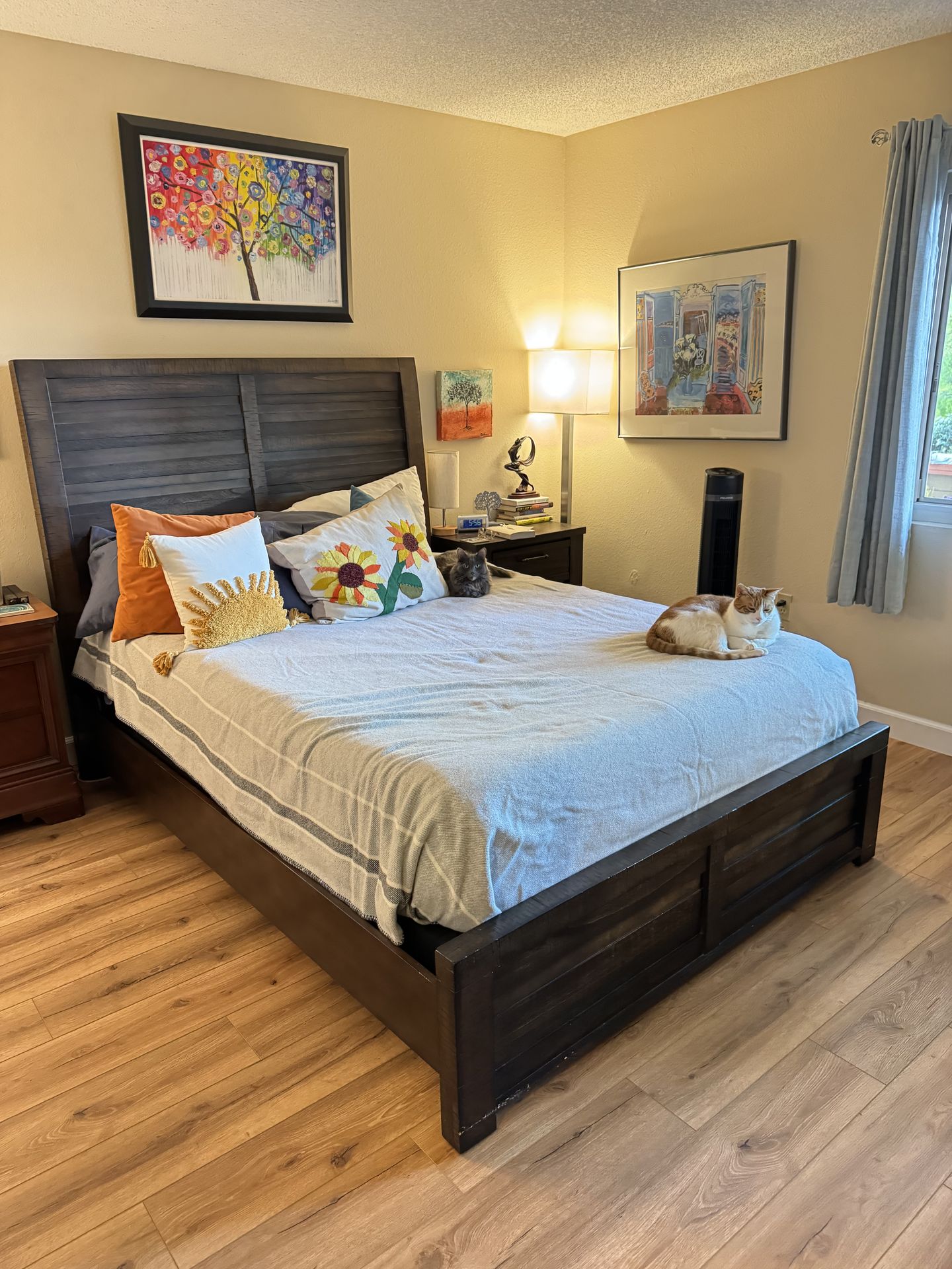 Good condition queen size bed frame with box spring for sale. Comes with dresser if you want it. If you don’t want dresser you don’t need to take it. Both items can be sold separately. Good condition minimal wear and tear.
