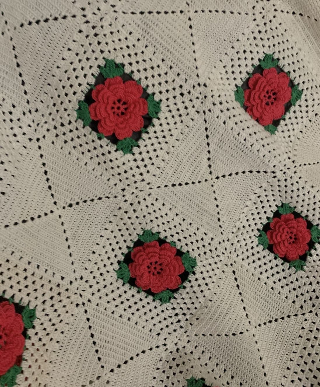 a touch of handmade charm to your home with this beautiful vintage crochet afghan blanket. Featuring a striking red rose floral pattern with green leaves on a soft white background, this blanket is skillfully crafted with detailed stitching and a lovely fringe border. • Handmade Crochet Afghan • Design: Red 3D Rose Floral Motif with Green Leaves • Color: White base with Red and Green Accents • Size: Approximately 70” x 108” (including fringe) • Material: Acrylic or cotton yarn (unspecified, feels soft and medium-weight) • Condition: Excellent vintage condition – no holes, stains, or odors noted • Style: Cottagecore / Shabby Chic / Boho • Perfect For: Bedspread, sofa throw, or decorative accent