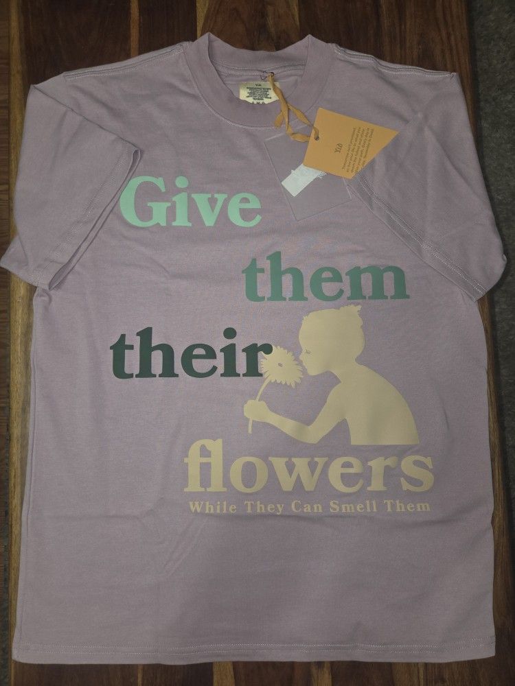 Lavender and green Yesterday Is Dead "Give them their flowers" cotton t-shirt. The puff print in front is beautifully done and colored. Such an amazing colorway on this one here. Retails at $75 at size Medium. Brand New with tags!