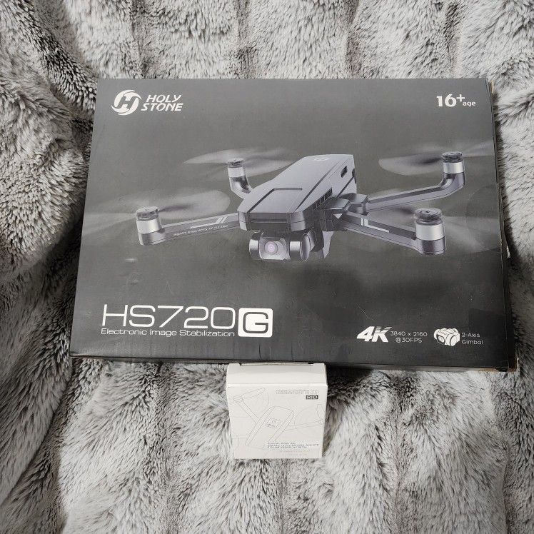 Holy Stone 720G Drone- 4k Video- 2 Axis Gimbal Bought it back in 2022, opened it but never flew it. Also have the required RID for the remote id, which was never registered and should be ready for anyone to start flying or learning to become a professional drone flyer. Product description from manufacturer. Capture Crisp Aerial Moments: Soar to New Heights of Aerial Excellence with the HS720G Drone, Enhanced by a Cutting-edge Sony Sensor. Whether you're capturing expansive landscapes or intricate details, the seamless synergy between the 2-axis gimbal and EIS stabilization eradicates vibrations, ensuring a tapestry of smooth and crystal-clear visuals. Mated with high-powered brushless motors, the HS720G 4K drone with camera achieves an unmatched level of stability. 4K Ultra HD Camera: Experience heightened clarity with the HS720G FPV drone's 4K camera, providing detailed imagery for your creative endeavors. The expansive 120° wide-angle lens ensures comprehensive coverage, capturing impressive vistas. With a remote control range of 999 meters, you have the flexibility to explore and capture your surroundings. Immerse yourself in genuine detail and sweeping landscapes, bringing your creative vision to life with HS720G 4k drone. 52-Min Max Flight Time: With dual batteries, the HS720G drone with camera for adults offers an impressive 52 minutes of continuous flight, doubling your time in the skies. Immerse yourself in extended exploration, capturing stunning vistas and unforgettable moments without pause. Elevate your aerial experience with HS720G mini drone's extended endurance. Powerful Brushless Motors: Upgrade your flying experience with the HS720G GPS drone, featuring brushless motors. Unlike conventional brushed motors, these advanced components ensure seamless, efficient, and remarkably quiet flights. Enjoy whisper-quiet precision, capturing pristine audio and visuals while minimizing disturbance. With extended battery life, embark on longer adventures and seize uninterrupted moments of awe-inspiring beauty.