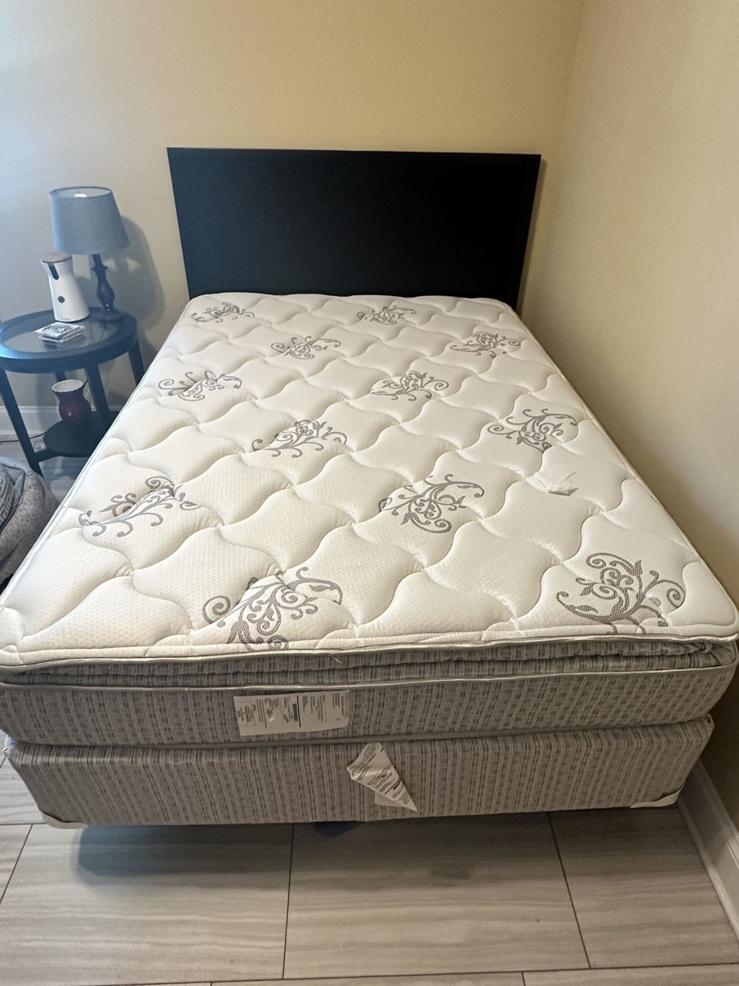Pillow top mattress with box spring, metal bed frame on wheels and black headboard - was kept in a guest room so barely used