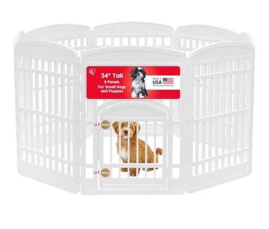 IRIS USA 34” tall dog playpen with door. Perfect for puppies, small dogs, or other pets to keep them safe indoors. This playpen is sturdy, easy to assemble, and the panels can be arranged in different shapes depending on the space. ⚠️ Original set includes 8 panels, this one includes 7 panels total, still providing a large and secure area for your pet. Great for training puppies, play areas, or keeping pets contained safely. Details • Brand: IRIS USA • Height: 34 inches • Panels included: 7 panels • Includes door panel with latch • Color: White • Durable plastic construction • Easy to assemble and move Condition Excellent condition. Pickup Local pickup in Mesquite / Dallas area.