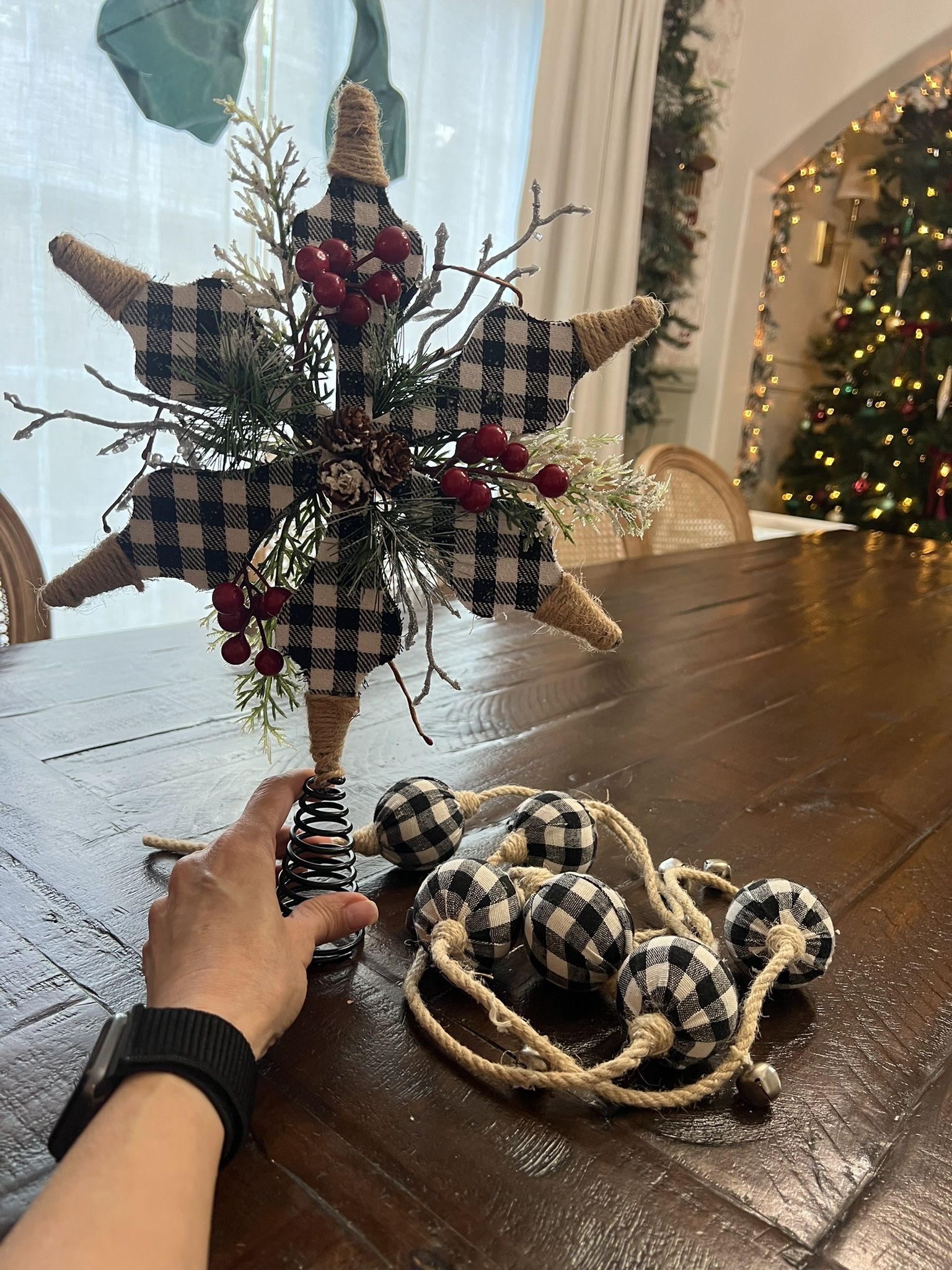 Beautiful rustic Christmas set! Includes a buffalo plaid tree topper with faux greenery, pinecones, and red berries, plus a matching fabric bead garland with jute rope and small bells. • Tree topper: Black & white buffalo plaid star with decorative greenery • Garland length: Approx. 72 inches (as shown in the photo) • Style: Farmhouse / Rustic Christmas décor • Condition: Gently used, in great shape Perfect for adding a cozy farmhouse touch to your Christmas tree or holiday decorations! Area 45 north and 960 $15 for both