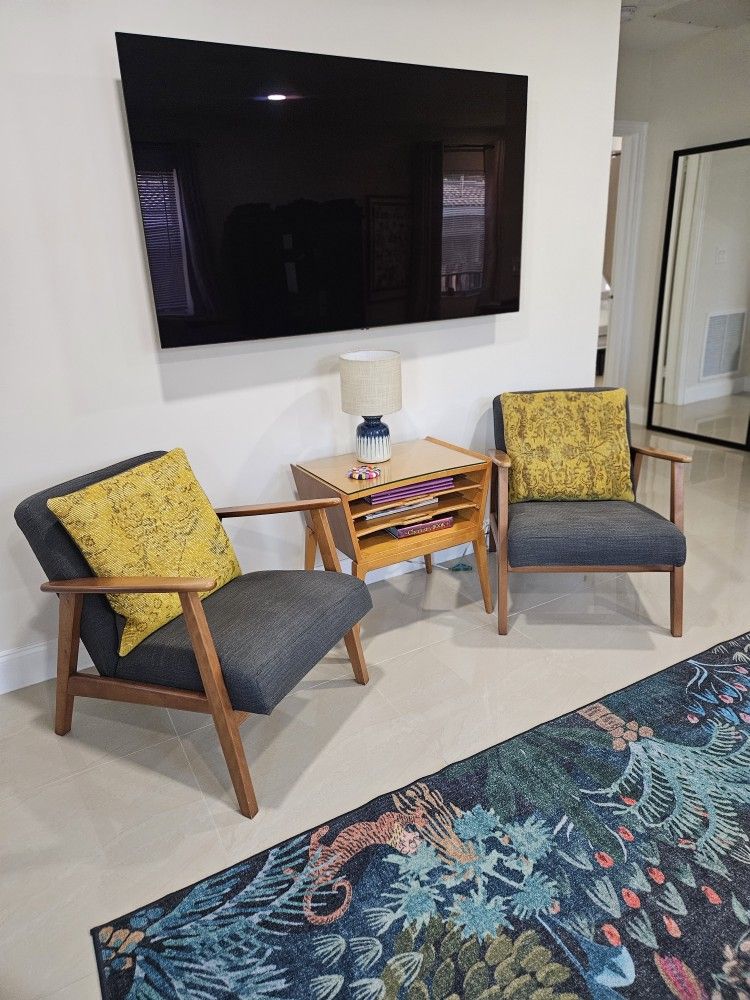 Modern set for $200. Includes: 02 wooden chairs 02 cushions 01 wooden side table 01 lamp