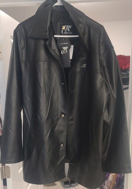 This XXL Men's Collezioni Italia Leather Jacket is a stylish and sophisticated piece perfect for a casual occasion. Made with high-quality leather and featuring a solid black color with button accents, this long jacket exudes an Italian theme. The jacket includes pockets for added functionality and is insulated with polyester for warmth during the winter season. Made by Armani Collezioni in Italy, this leather jacket is a must-have for any wardrobe, offering a touch of luxury and comfort for the modern man.