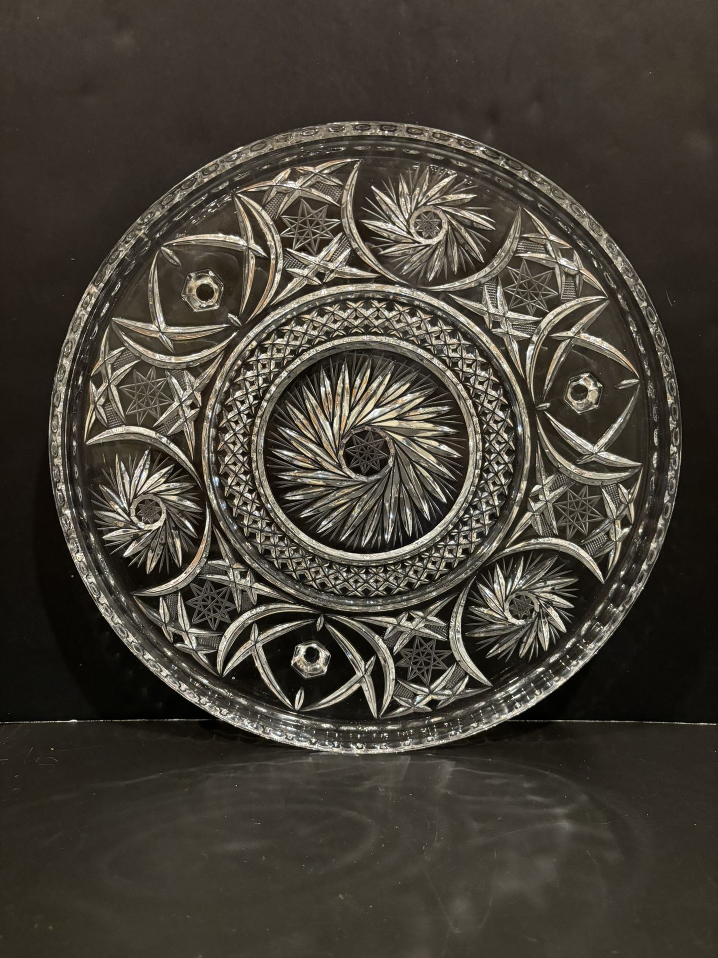 This vintage crystal platter from Czechoslavakia features a beautiful pinwheel and star pattern, making it a perfect addition to any collection. This piece has a timeless appeal which makes it a versatile piece for any table setting. Measuring 12” in diameter and 1 3/8” height.